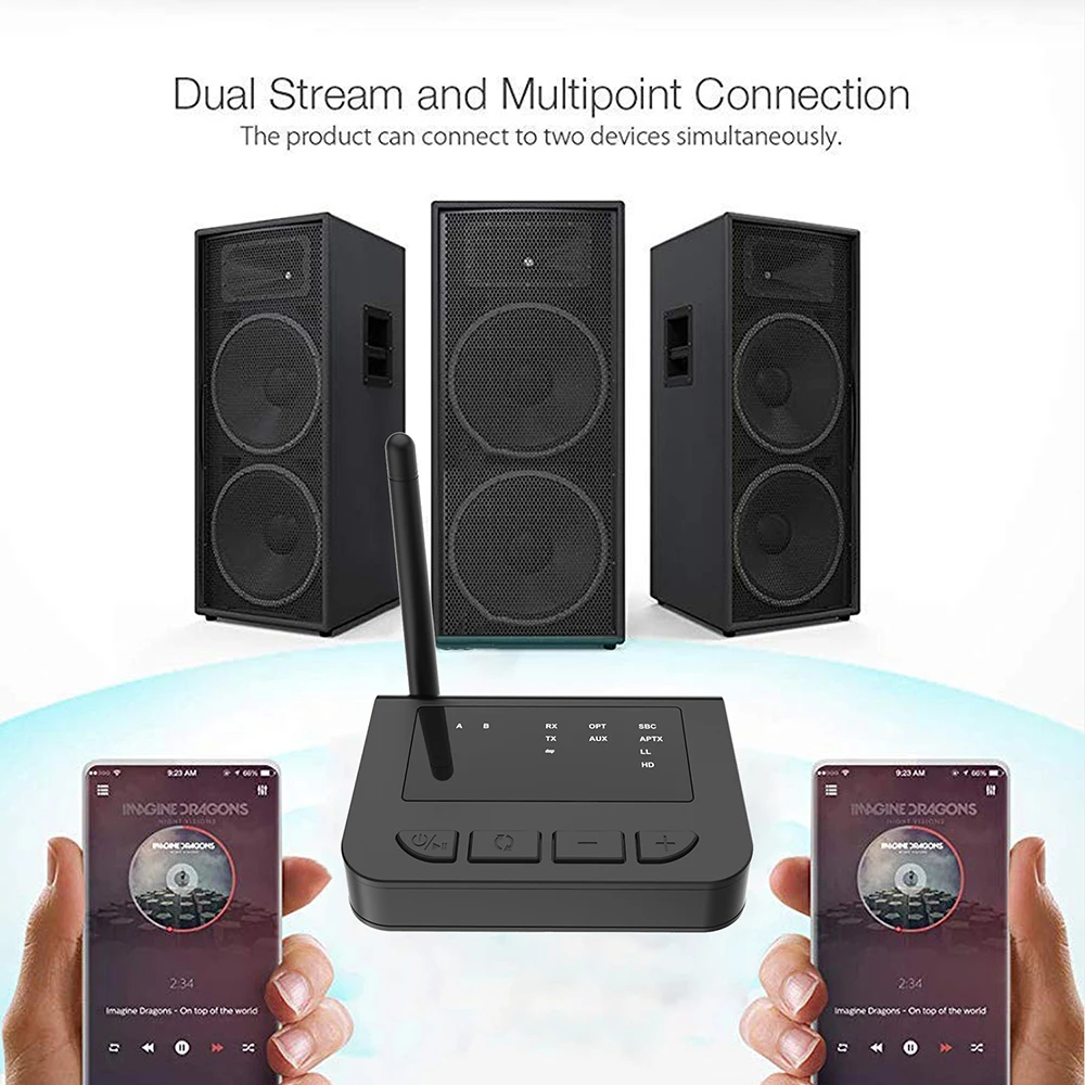 Support Dual Stream in TX Mode and Multi-Point Connection in RX.Pair with two bluetooth headphones/speakers,sharing fun without disturbing others.Or connect two smart phones at the same time,also has a memory function that automatically connects to the last paired device. Supports 3.5mm AUX & RCA digital audio connections/fiber optic audio inputs and outputs.