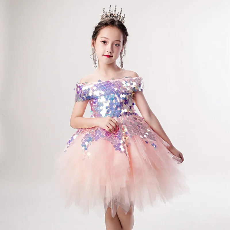 Платье принцессы для девочек B019, 2020 розовые платья с блестками и цветочным принтом для девочек элегантное бальное платье с коротким рукавом и вырезом лодочкой