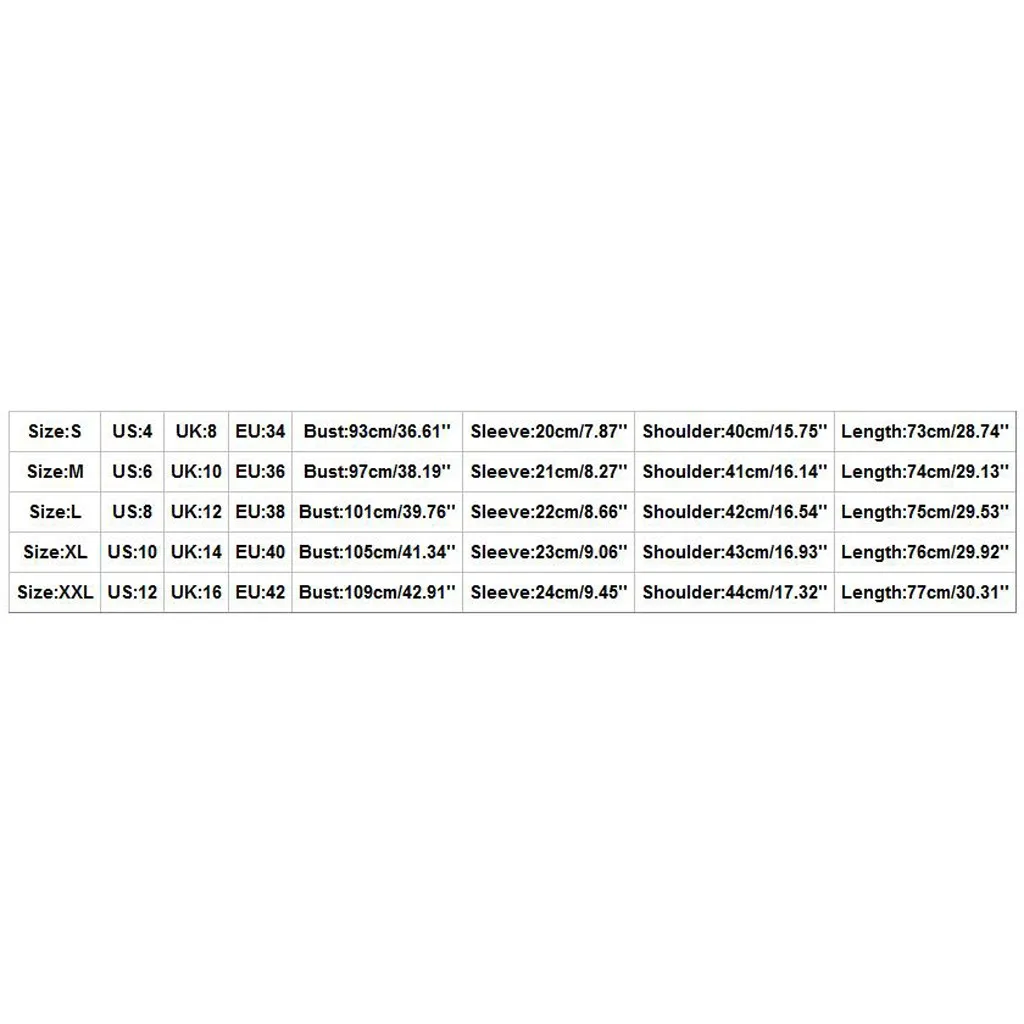 | Размер: S | США: 4 | Великобритания: 8 | ЕС: 34 | Обхват груди: 93 см/36,61 дюйма | Рукав: 20 см/7,87 дюйма | Плечо: 40 см/15,75 дюйма | Длина: 73 см/28,74'' |
