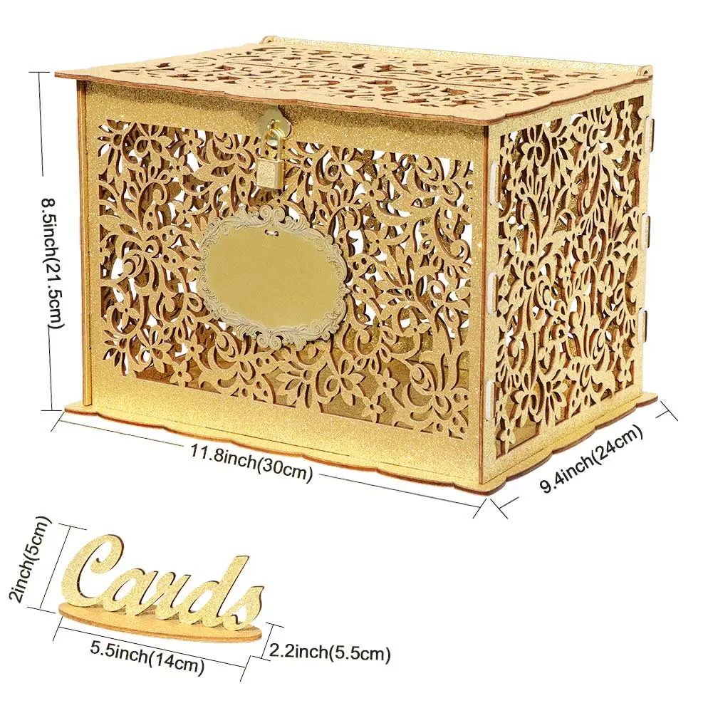 Цвет: Золотой Размер: 30*24*21,5 см Материал: дерево Вес: 450 г Применение: уникальная коробка для свадебных открыток с замком-Отличное дополнение к вашему свадебному декору.