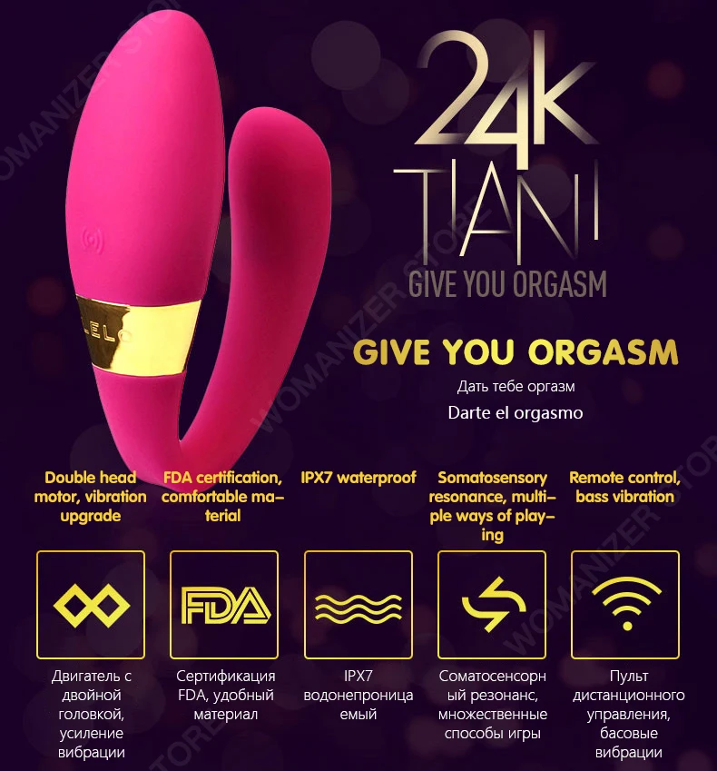 Диани™24k имеет позолоченное кольцо 24k с уникальным серийным номером продуктов с лазерной гравировкой. Благодаря двойному двигателю массаж становится еще более мощным, что делает любовь уникальной, красивой и запоминающейся. Когда влюблена, ее носят женщины. Сильная вибрация может управляться удаленно, а эксклюзивная соматосенсорная Интерактивная технология LELO может использоваться для повышения удовольствия обеих сторон. Изысканная маленькая и гладкая силиконовая форма обеспечивает ей более полный опыт и делает его чувствовать себя сильнее. Tiani™24k является гибким и эластичным, чтобы удовлетворить все ваши позиции. Гарантийные условия оригинальная Лицензия; Фабрика или агент предоставляет один год в Гонконге Отличный роскошный чехол из массажер Диани™24k оснащен двумя двигателями, которые могут улучшить Сенсорное удовольствие обеих сторон в то же время и принести более сильное разделение пикового удовольствия. Позолоченное кольцо 24k Уникальный серийный номер напечатан на каждом тиани™Кольцо из золота 24К, который является нашим торжественное обязательство удовольствия. Эксклюзивный соматосенсорные интерактивный Технология™ Используя соматосенсорный интерактивный пульт дистанционного управления LELO, вы можете Беспроводное управление массажером в пределах 12 метров, открывая неограниченные забавные возможности для обеих сторон. Перезаряжаемые Близко к тихой вибрации, более мощный 100% полный корпус водонепроницаемый Безопасно для использования в ванной и душе Пульт дистанционного управления беспроводной дистанционный пульт Создавайте уникальные узоры страсти, более дикие и веселые 5 весело настройки Стоны для слезления или сильных вибраций, все, что вы хотите Инструкции Разогреть подготовки TIANI™24k можно вставить и использовать. Маленькая Массажная рука вставляется в женское тело, в то время как большая Массажная рука стимулирует чувствительные точки за пределами тела. Самый простой Массажер для использования перед любовной драмой. Изо всех сил Небольшой компактный массажер, но обе стороны чувствовали ее мощные вибрации. TIANI™24k можно использовать в любом положении, но большинство людей считают, что миссия-это самая простая в использовании. Если она может вас порадовать TIANI™24k может не только удовлетворить вашего партнера, вы можете поместить ее в свое тело или использовать его с другими любимыми игрушками. Технические характеристики Материал: Силикон для безопасности человеческого тела/ABS / 24k золото Размеры: 88x30x44 мм. Длина вставки: 70 мм Вес: 50 г Аккумулятор: li-ion 200 мАч Индикация во время зарядки: 2 часа при температуре не выше 5,0 вольт Применение время: Время работы от аккумулятора до 1,5 часов Время работы в режиме ожидания: 90 дней Максимальный уровень шума: менее 50 дБ Интерфейс: 1-кнопочный рабочий интерфейс/беспроводной пульт дистанционного управления
