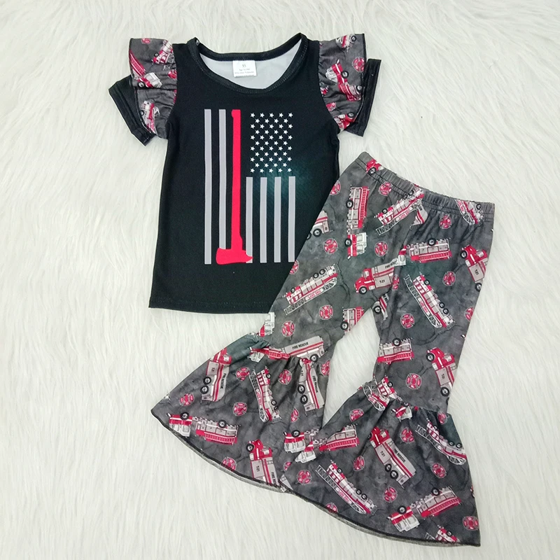 Весенняя эксклюзивная Одежда для маленьких девочек; Милые тонкие футболки красного цвета; Брюки с изображением пожарной машины и колокольчиком; Детская одежда