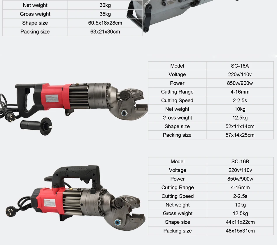 Размер (Д * Ш * В):44x11x22 Сертификация: CE ROHS KC Напряжение: 220 В/110 В, 220 В/110 В Мощность (кВт):850 Применимые отрасли: магазины строительных материалов, ремонтные магазины машин, розничная торговля, Домашнее использование, строительные работы Основные пункты продажи: энергосбережение Вес (кг):10 Название продукта: резец арматуры Функция: отрезать стальной стержень Скорость резки: 2-2.5s Диапазон резки: 4-16 мм Цвет: на заказ Мощность двигателя: 850 Вт/900 Вт Вес брутто: 12,5 Вес нетто: 10 Применение продукта Подходит для строительный арматурный профиль отрезан. Этот продукт-светильник небольшого размера, легко носить с собой. Нет искры и пыли Во время резки, безопасно и надежно. Модель SC-16B Напряжение 220v/110v Мощность 850 Вт/900 Вт Диапазон резки 4-16 мм Скорость резки 2-2.5s Вес нетто 10 кг Вес брутто 12,5 кг Размер формы 44х11х22см Размер упаковки 48х15х31 см