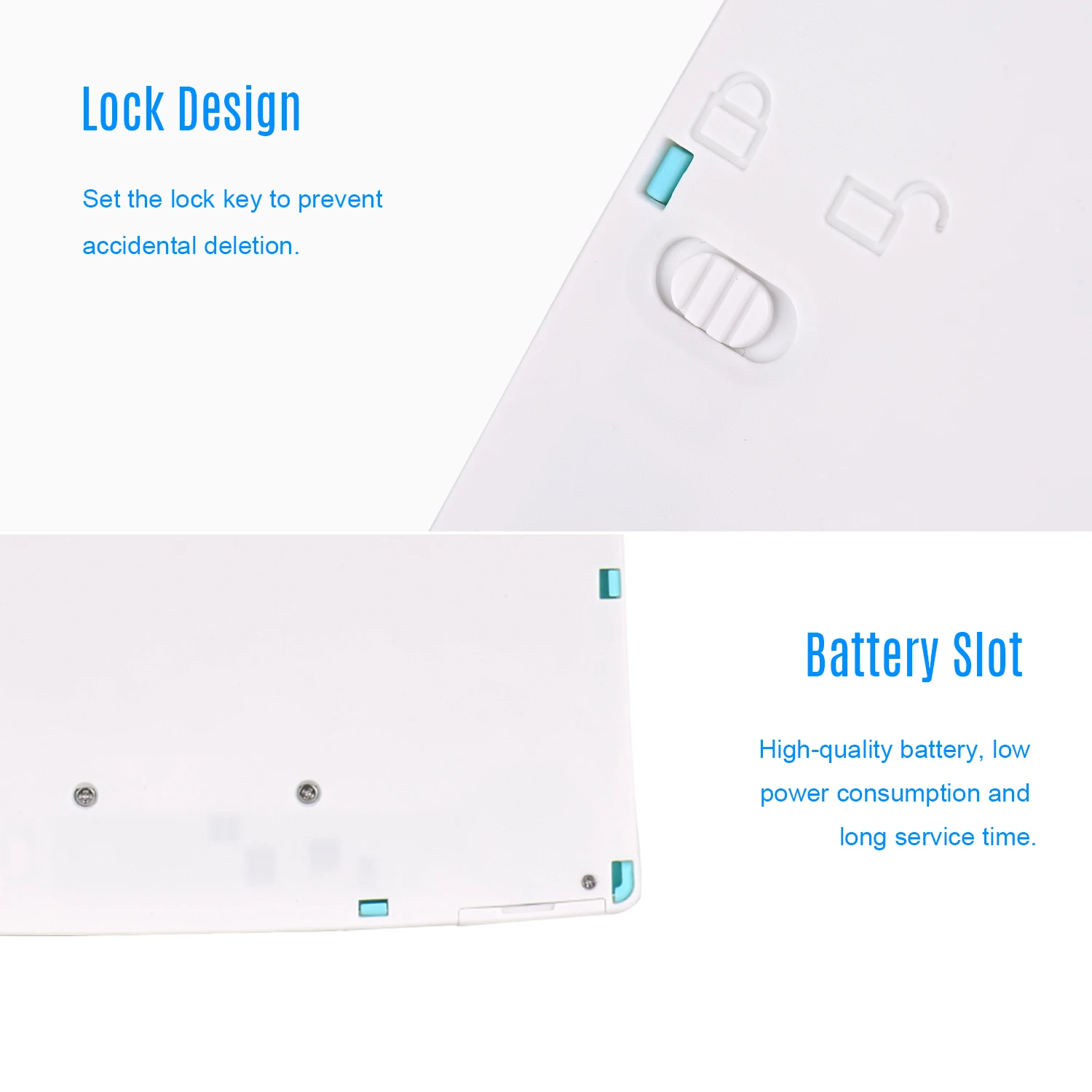 Оснащенный прозрачной клавишей, вы можете очистить полный экран одним щелчком, что удобно и быстро, и экономит бумагу и защищает окружающую среду. С ключом блокировки для предотвращения случайного удаления.