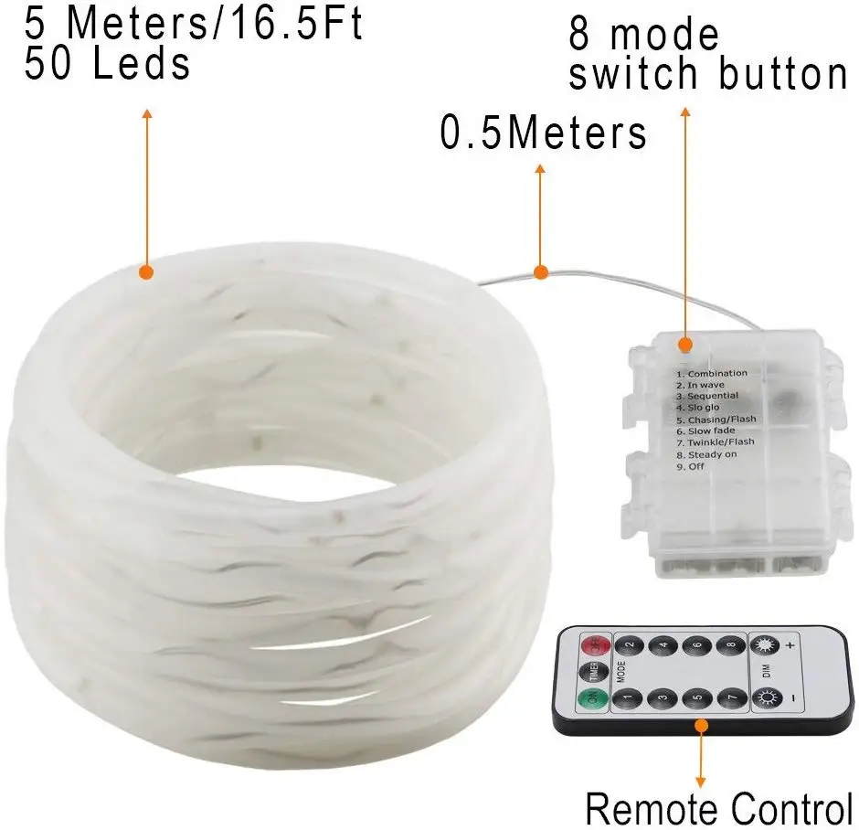 🎁Декоративный Канатный светильник с пультом дистанционного управления, прекрасный подарок для ваших друзей или семьи! 📡Универсальный пульт дистанционного управления: -8 режимов освещения: Комбинация; В волне; Последовательный; Slo glo; Чеканка/вспышка; Медленное затухание; Мерцание/вспышка; Устойчивое включение; -10 уровней яркости: разные светильники создают различные декорирующие эффекты и атмосферу. -Режим таймера: после активации индикаторы автоматически останутся включенными на 6 часов и выключенными на 18 часов. -Один пульт может управлять несколькими огнями одновременно. Направьте пульт дистанционного управления на чехол аккумулятора. 💏Декоративное Применение: Украшение ваших садовых растений, двора, коридора, лестницы, патио, рождественской елки. Эта веревочная проволочная гирлянда сделает ваш дом романтичным и уютным. ✨Сделай Сам ночник: Смело заверните их край кровати, чтобы сделать прекрасные ночные светильники для вашей спальни; С помощью пульта рядом, чтобы включить/выключить их, не вставая из кровати, наслаждайтесь сладкими снами! ☔Водонепроницаемость: IP65: И провод, и чехол для аккумулятора водонепроницаемые, прекрасно работают даже в дождливые дни (Избегайте погружения чехла аккумулятора в воду), идеально подходят для использования на улице. Характеристики: Длина струны: 16.4ft/5M 32.8ft/10M Кол-во светодиодов: 50/100 шт. Питание: батарейка 3xAA (не входит в комплект) Батарейка CR2025 для пульта дистанционного управления (не входит в комплект) Примечание: Перед использованием вытащите пластиковый лист, вставленный в батарейный отсек. Мощность: 0,35 Вт Входное напряжение: 4,5 В постоянного тока Выходное напряжение: 2,57 В переменного тока Цвет: теплый белый/Разноцветный Регулировка яркости: Да Материал: пластик, ПВХ Посылка входит: 1 x разноцветные гирлянды 1 пульт дистанционного управления 🌟Советы: Вы можете сэкономить, используя аккумуляторные батареи. Если индикатор слабый или отображает только один цвет после более 60 часов непрерывного использования, замените три новые батареи. Если вы не используете в течение длительного времени, пожалуйста, выньте батареи.