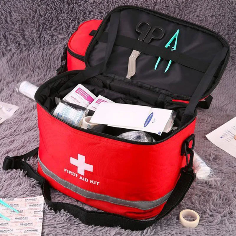 First Aid Kit Large Shoulder Strap Portable Car Emergency Medical Bag Home Travel Outdoor Survival Kits Camping Storage Bag FEATURES: 1.Striking cross symbol to make you easier to find in the outdoors. 2.High-density ripstop, waterproof fabrics. 3.Handle as well as pockets hanging at his waist. 4.Full open zipper for easy pick-and-place items. 5.Within many pockets and classification compartment. SPECIFICATIONS: Material: Nylon Size: 28*19*20cm Weight: 380g Color: Red/Blue PACKAGE INCLUDED: 1 x first aid kit (Bag only, drugs not included)