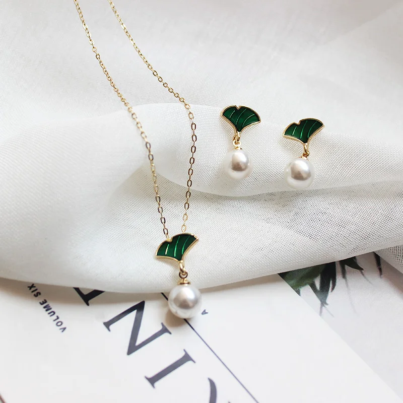 Корейский стиль Элегантные эмалированные серьги в виде листьев гинкго милые серьги-капли с имитацией жемчуга гинкго билоба женские ювелирные изделия набор