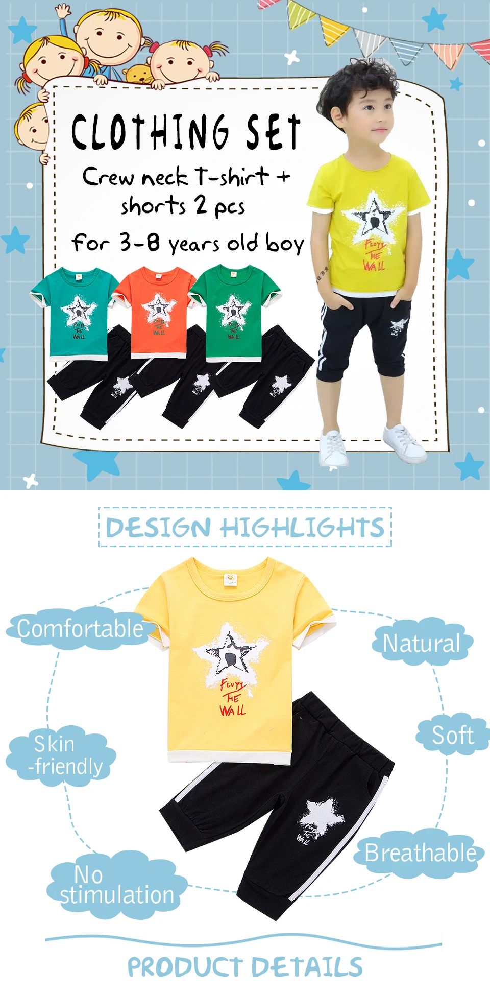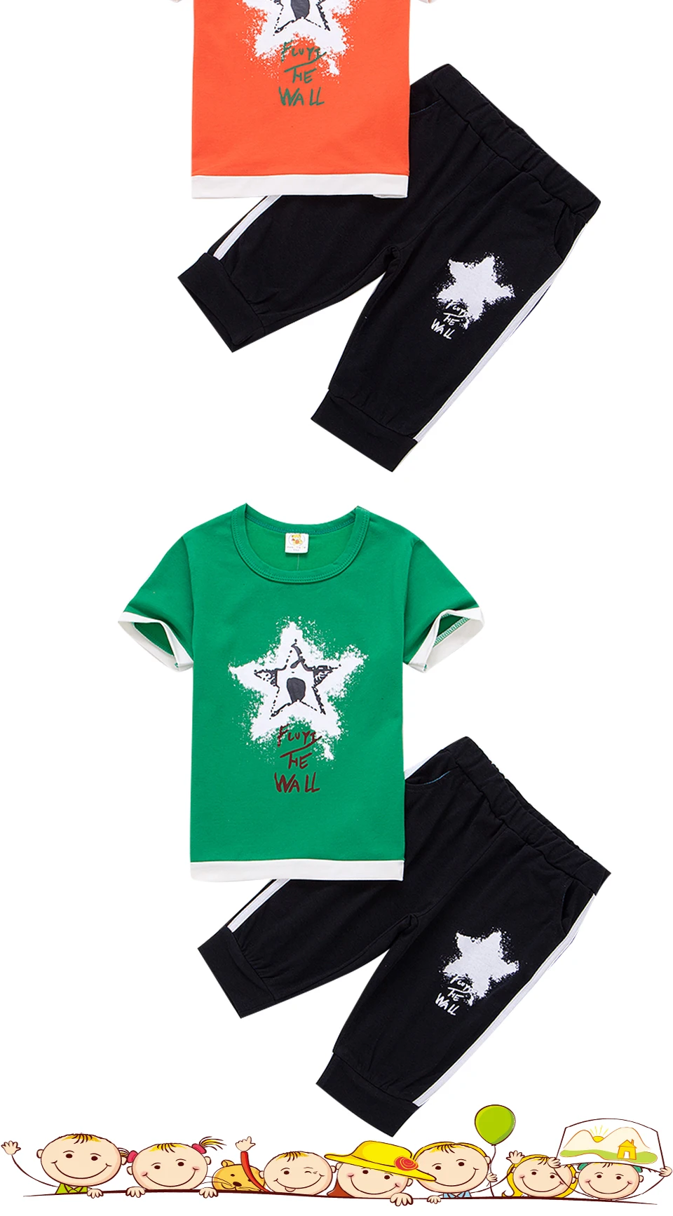 Это новый летний детский костюм для мальчиков 2020, повседневная спортивная одежда для мальчиков, очень модная и модная. Есть Оранж, желтый, синий и зеленый. Цвет одежды монохромный, есть большая пентаграмма и некоторые буквы посередине, брюки черные, а также есть пентаграмма, И по бокам брюк в полоску. Ткань растягивается из хлопка, который не легко мнется, не легко выцветает, износостойкий, приятный для кожи и удобный, лучший выбор для детей!
