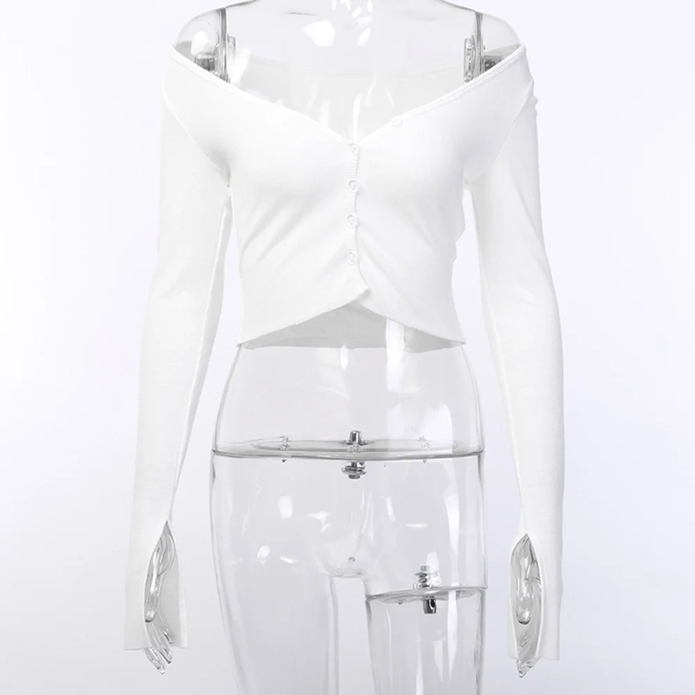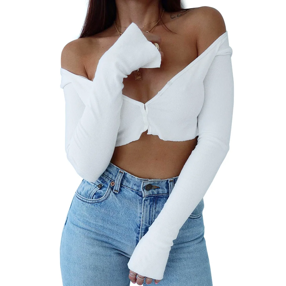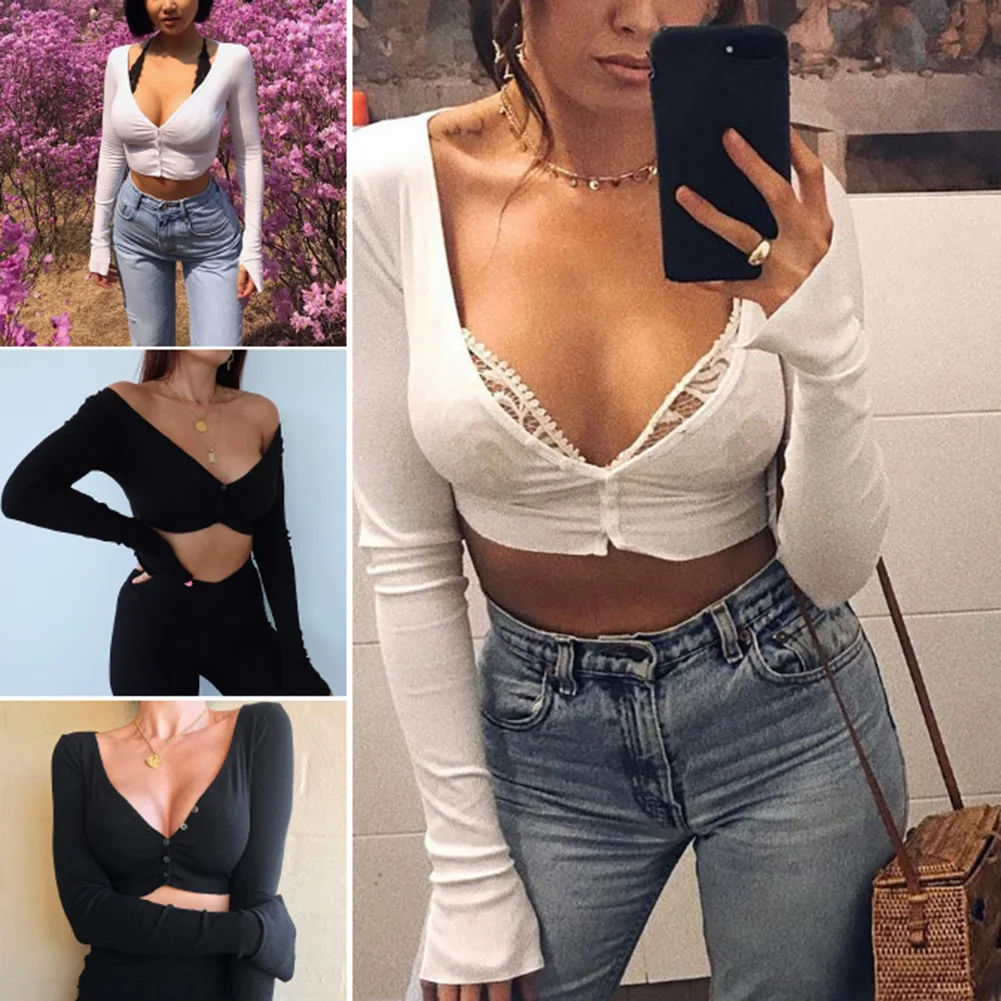 Сексуальный женский однотонный топ с длинным рукавом и глубоким v-образным вырезом на пуговицах, трикотажный топ с открытой спиной