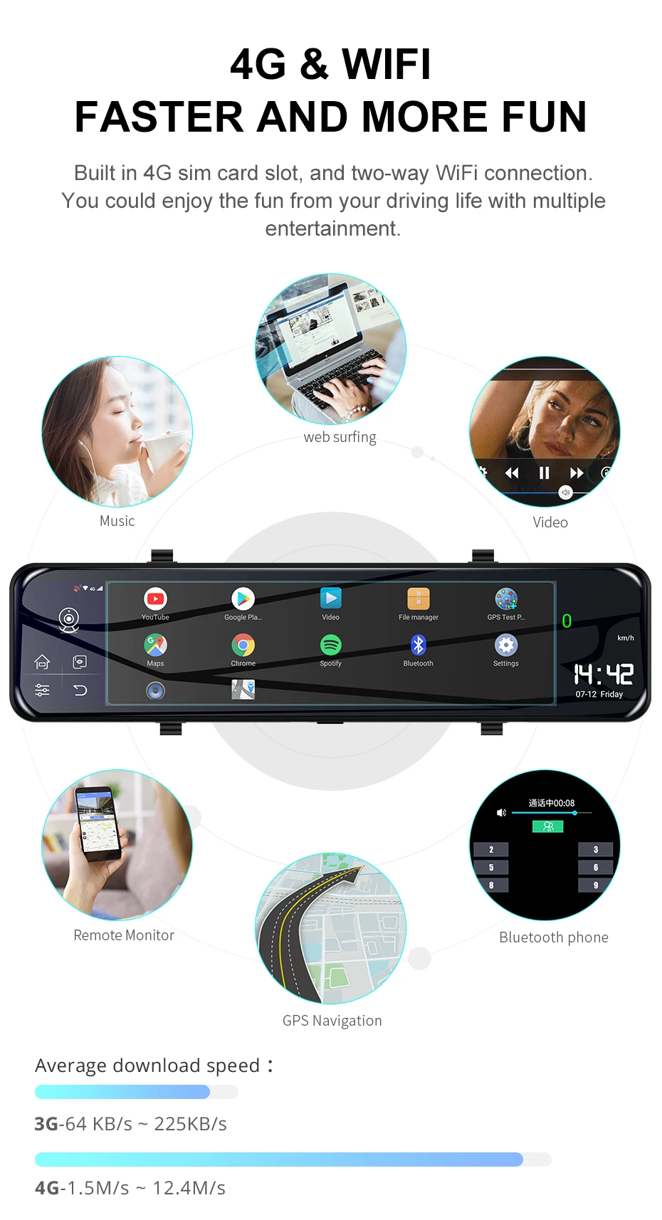 Загрузите ваш любимый GPS во внутреннюю память, с дополнительной GPS антенной, этот Видеорегистратор обеспечивает лучший опыт независимо от места назначения. Кроме того, это сетевая функция 3G/4G, помогает dvr быстрее и плавно получать онлайн gps-навигацию.