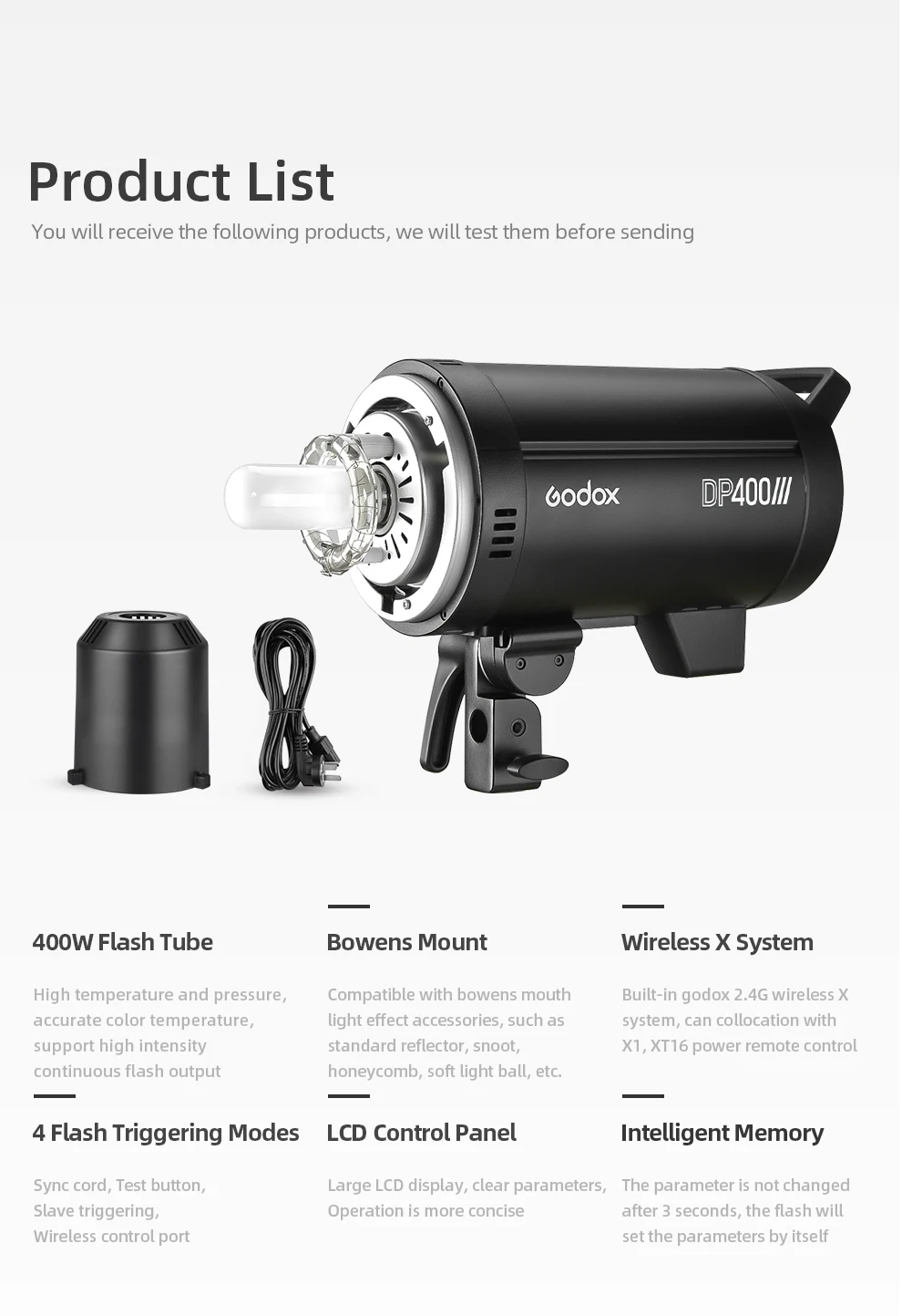 Комплектация:2x Godox DP400 III2x Godox 60 см x 90 см софтбоксы2x Godox 303 2,8 m световая стойка1x триггер Godox X1T1x Godox BD-04, сотовая сетка для двери сарая, 4-цветный фильтр + отражатель с креплением Bowens1x отражатель Godox 5 в 1 90x120 см![]()