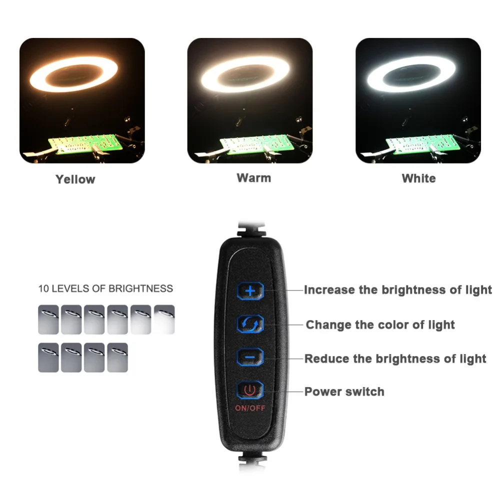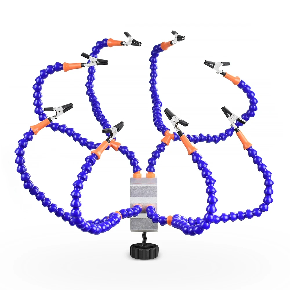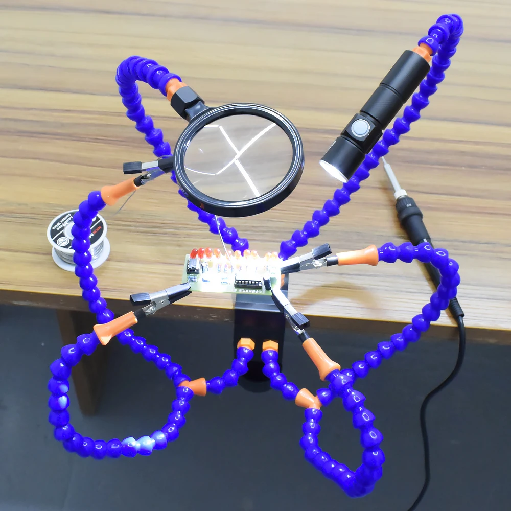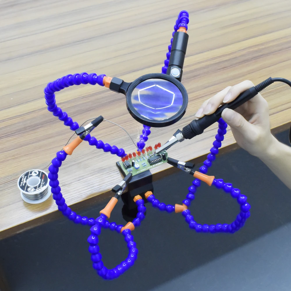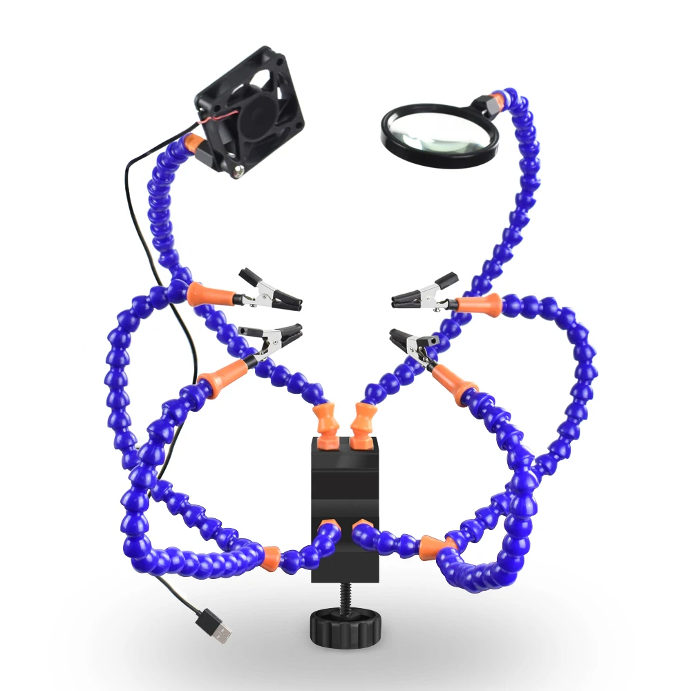5. Гибкие ручки с зажимами типа «крокодил», 1 шт. увеличительное стекло 3X-5X, 1 шт. 1X-4X масштабируемый перезаряжаемый usb-фонарик, 1 шт. бесщеточный вентилятор USB DC, можно снять зажим/увеличительное стекло/фонарик.