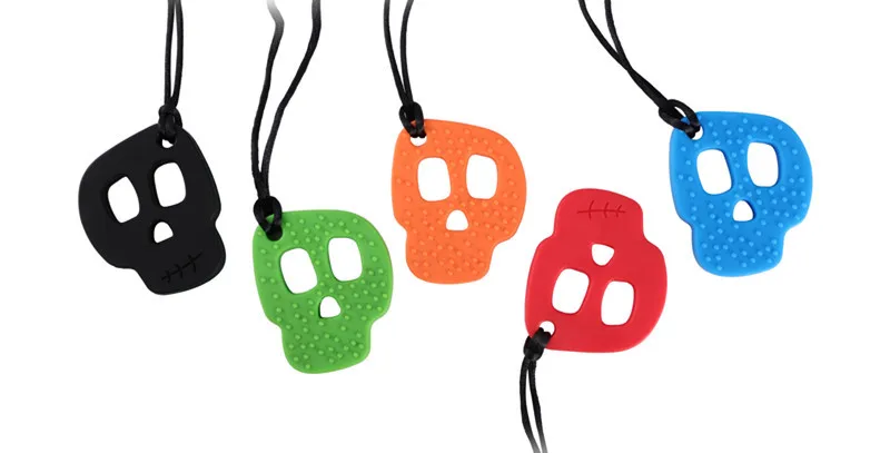 Material: 100% food grade silicone,non-toxic, free from BPA,Lead,Cadmium,Phthalates, PVC and Latex Size: 50x60x10mm Medium hardness,firm and chewy Cool Skull Shape,smooth one side,while the other side has raised nubs for sensory input. Helpful to individuals who are developing initial oral motor skills,exercise the mouth muscles and build oral strength. Help relieve stress,stay calm and effectively stop them from chewing shirts or biting fingernails.