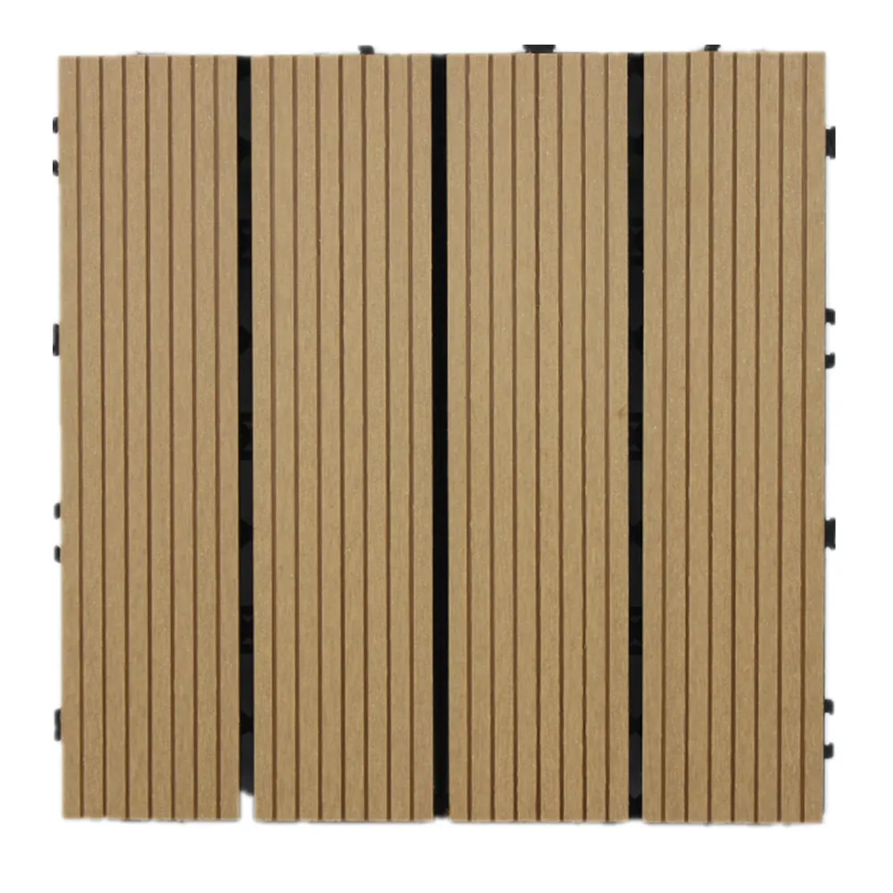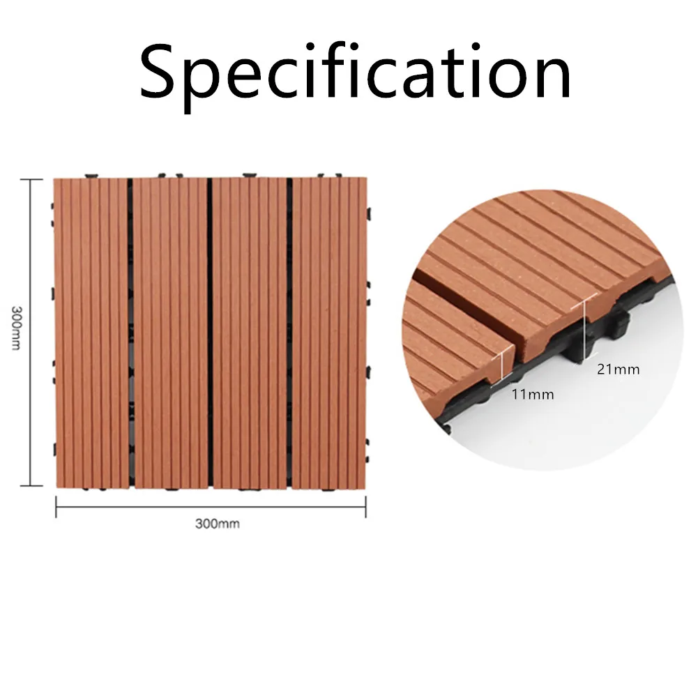 Полностью наш комбинированный Пол WPC изготовлен из высококачественного материала, что позволяет уменьшить уровень шума и обеспечивает повышенную эластичность и устойчивость к буферам, а также имеет функцию снятия давления и ударов. Каждая плитка состоит из квадратного пластикового основания 30 см х 30 см с 4 планками из прочного деревянного пластикового композитного материала, прикрученные на основание. Все напольные плитки идентичные, для соединения используется система блокировки. WPC соединенный пол имеет дренажные отверстия на задней стороне, через которые протекает дождь или вода. Легко моется, просто подметает и моется при помощи шланга. Инструменты и клеи не требуется. Складывается в планках, чтобы минимизировать скольжение. Покрытие из 11 плиток, 1 кв. М