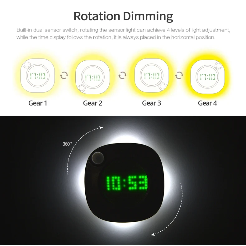 1. Индукционная лампа для человеческого тела: отображение времени, поворотное затемнение, индукция человеческого тела, переключение на холодный и теплый светильник, Магнитная Адсорбция, источник непрямого светильник. 2. Индукция человеческого тела: с использованием индукционной питьевой светильник человеческого тела, чувствительная технология, в темной среде, люди проходят через Область обнаружения, светодиодный светильник будет автоматически освещать освещение, И автоматически погаснет через 20 секунд. 3. Отображение времени: Светодиодный индикатор 108 класса Time matrixs, когда ночь проходит, отображается текущее время, встроенный независимый чип управления питанием часов, часы все еще могут работать стабильно, когда продукт низкий, не нужно часто устанавливать. 4. Вращающийся затемнения: встроенный двойной-зондирования переключатель, вращающийся датчик светильник может осуществить 4-х скоростной светильник регулировки, в то время как отображение времени в следующем вращение, всегда в горизонтальном положении. 5. Холодный и теплый светильник: предустановленный два набора желтый/белый светильник, может быть переключен на заднюю кнопку, желтый светильник 2800K, подходит для ночной Светильник, чтобы создать атмосферу, белый светильник 4500K, подходит для временного чтения, ручной светильник ing и так далее. 6. Магнитная Адсорбция: Встроенный сильный магнит в задней части может адсорбироваться к стене через распределение магнитного листа или непосредственно адсорбироваться на холодильнике и железной раме, это просто и удобно. Четыре стороны освещены светильник, и светильник мягкий и не стучит глаза. 7. Подходящая сцена: применимый светильник, такой как: кухня, ванная комната, спальня, ванная комната, шкаф и т. д.