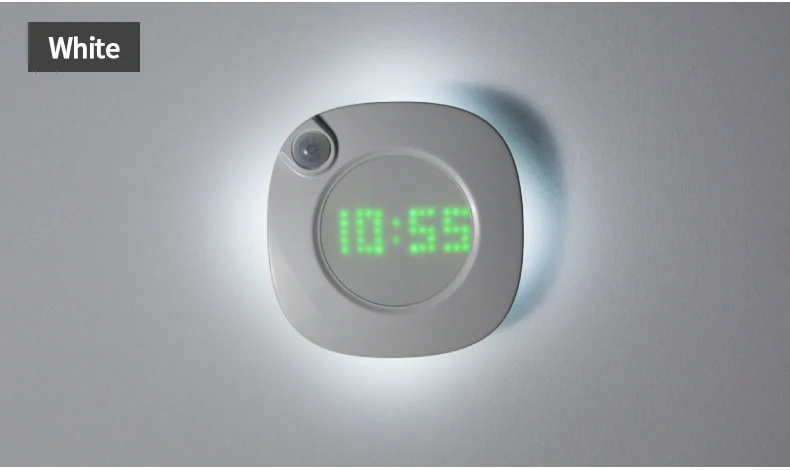 Материал: пластик Товар: светодиодный настенный светильник Ночной светильник с часами Три датчика s: инфракрасный датчик человеческого тела + светильник + датчик силы тяжести. Тип: питание от аккумулятора/зарядка от USB Источник питания: 3 * AAA батареи (не входят в комплект)/встроенный аккумулятор (600 мАч) Светильник Цвет: два Цвет s может быть переключатель (белый/теплый белый) Время работы в режиме ожидания: около 1200 часов Цвет корпуса: белый
