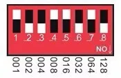 DMX512 start address code-это сумма переключателей 1-8, в то же время поверните нижнюю сторону кодового переключателя (вкл. «1»), затем можно получить значение бит; Переключатель кодирования (Установите значение «0»), значение бит равно 0.