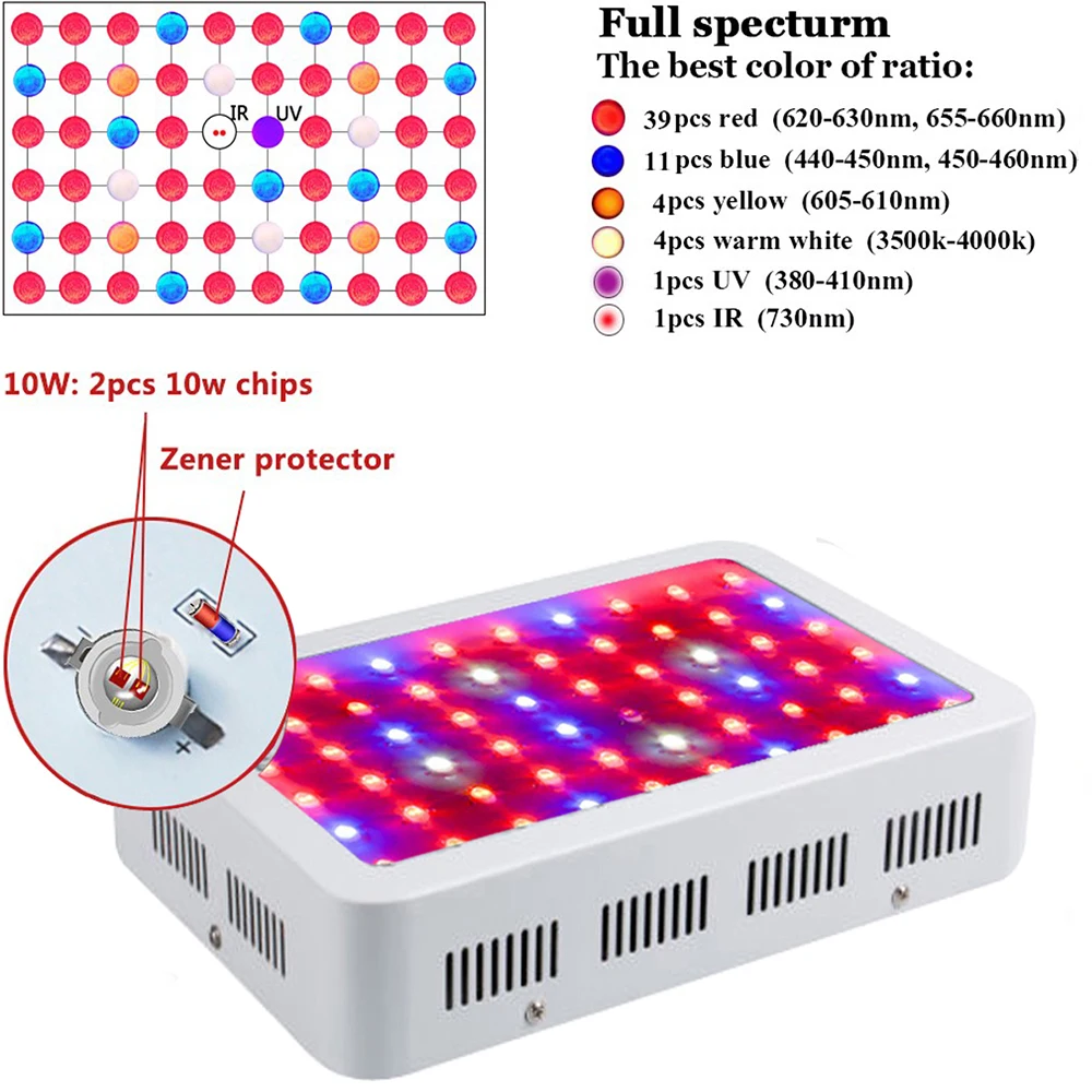 Полный спектр и высокая производительность --- этот светодиодный светильник полного спектра поставляется с 100 шт. супер яркий светодиодный s, длина волны 410nm-730nm, включая УФ-ИК-красный синий и белый. Подходит для всех этапов роста, таких как рассада, прорастание, Вегетативное и цветущее растение, которое может эффективно улучшить производство растений и Качество собранных растений.