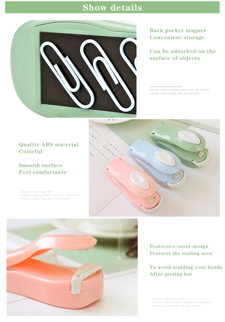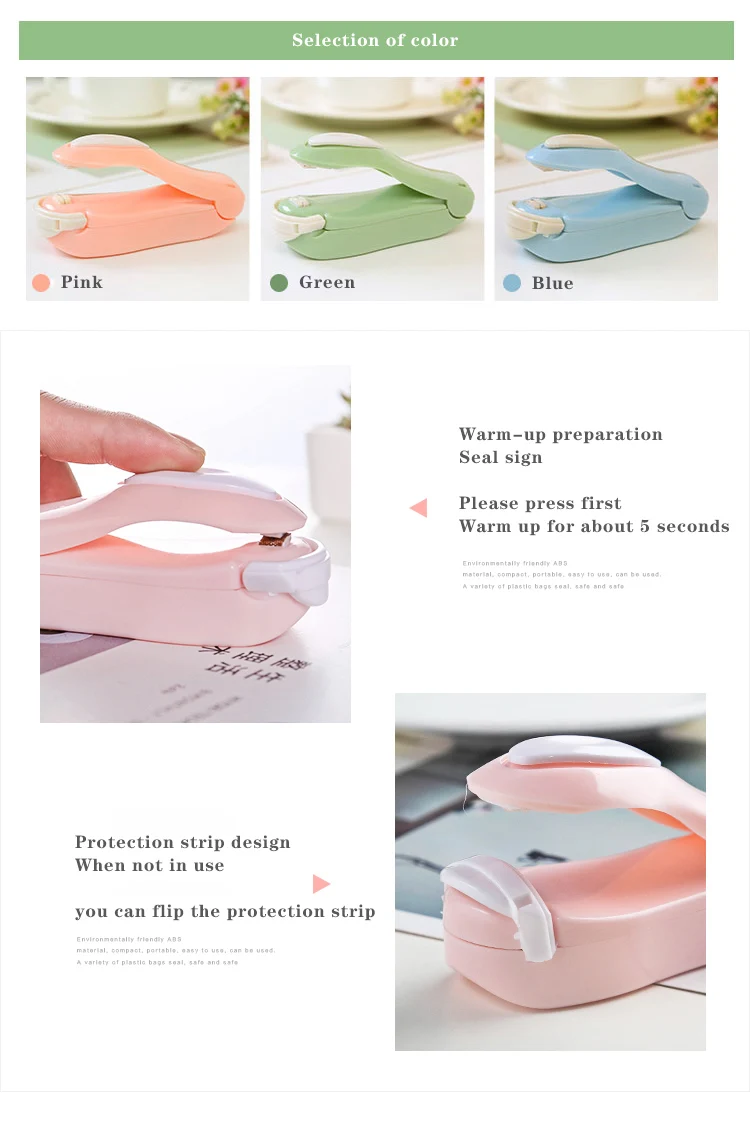 Kinldy Notes Пожалуйста, вставьте 2 батарейки AA (не входят в комплект) и отметки «+»-«-», убедитесь, что батареи находятся в правильном положении. Идеально подходит для сохранения свежести Идеальное запечатывание неиспользуемых частей еды, закусок, приправ, ингредиентов в полиэтиленовых пакетах. Принцип работы Нагрев для расплавления полиэтиленового пакета. После установки батарей, пожалуйста, предварительно Нагрейте упаковщик, нажав 5 секунд перед использованием.