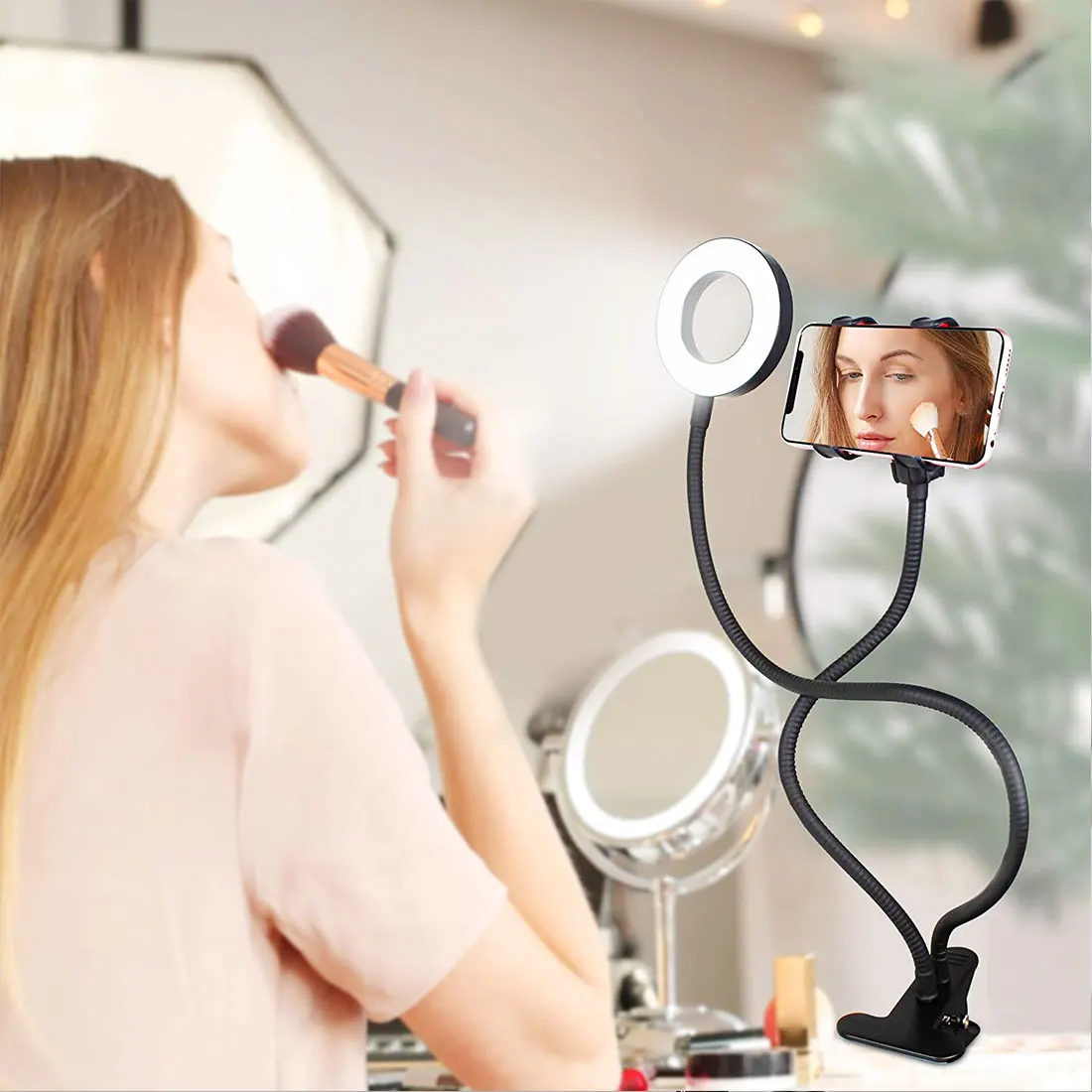 1. Кольцевой светильник для селфи с креплением для телефона с гусиной шеей-отлично подходит для видеозвонков, телекоммуникационных звонков, потокового вещания в социальных сетях и влиятельных лиц. Режимы питания и освещения контролируются простым и удобным пультом дистанционного управления.