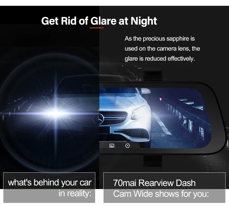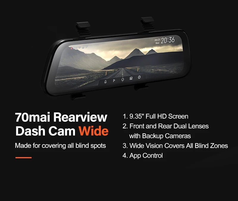 С фронтальными и задними камерами 1080P, видеорегистратор заднего вида 70mai с широким разрешением записывает видео с двойным видением без каких-либо слепых пятен. (видео обеих камер имеют доступ к sd-карте по вашему желанию.)