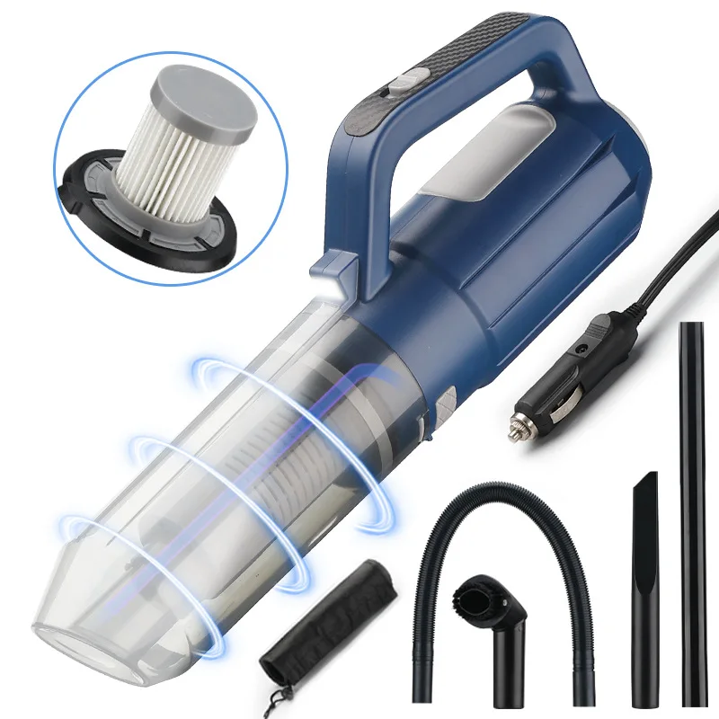 This is a powerful black technology vacuum cleaner Functions include: vacuuming / blowing / blowing / lighting Using high-quality all-metal motor set Front 2 X LED SMD lights, rear blower Design Features: Dust cup double buckle, more tight, to prevent the dust cup from detaching during use The handle is decorated with carbon fiber, which can be pinched in two directions, ergonomically, it can be pinched very comfortably and use various functions Main function description: 1. Vacuum function: High vacuum degree combined with tapered large-diameter suction port, higher vacuum efficiency, stable vacuum noise, double-layer filter, the suction power is more durable, can be combined with various auxiliary suction heads according to different scenes, easy to complete cleaning 2. Dust blowing function: High wind speed and high air volume, can be used in conjunction with the various accessories provided, can blow off the dust adsorbed on the surface of the filter element, so that the problem of clogging the filter element can be solved in one machine, and the garbage scattered in the car body can also be blown off. Dust in the engine compartment, dust on the surface of the car air-conditioning filter, garbage on the car floor mats, etc. 3. Inflatable function: Can be used in conjunction with the provided inflatable mouth to inflate low-pressure inflatable products such as inflatable mattresses, inflatable pillows, swimming rings, balloons, etc. packing list: Extension tube 34CM X 1 Hose 55CM X 1 Flat mouth 16CM X 1 Rotating brush X 1 Inflatable head X 1 set