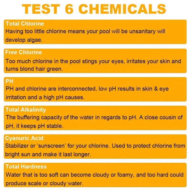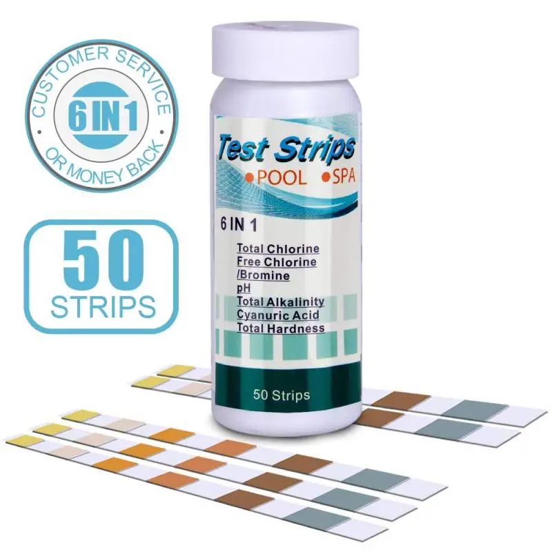 Набор тест-полосок 6 в 1? Тест-полоски для химических тестов в бассейне для 6 параметров: общий хлор, свободный хлор/Бром, pH, общая Щелочность, цианурная кислота, общая твердость.