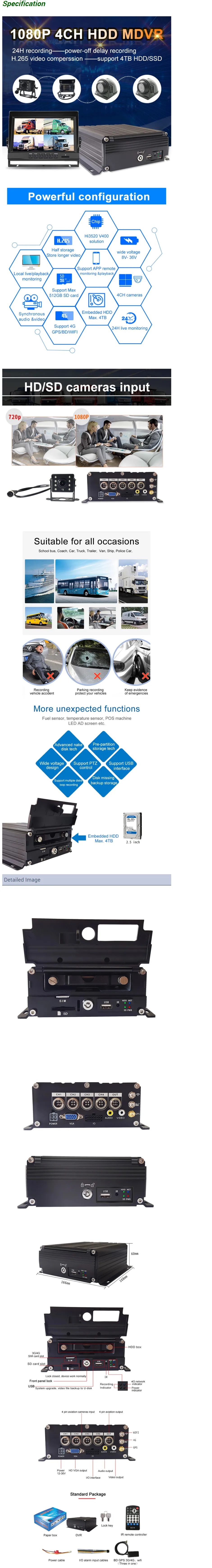 Внимание: если вы хотите купить оптом, пожалуйста, свяжитесь с нами. Большое спасибо. (1) его решение, H.265 сжатие, многопотоковая запись, 4ch в реальном времени 720P AHD/TVI/CVI вход/4ch не в режиме реального времени 1080P AHD/TVI/CVI вход (2) Высококачественная запись в реальном времени, 1080P/960P/720P/CIF/HD1/D1 опционально (3) 8-36 в широкое напряжение, обеспечивает обратное напряжение/перегрузку/защиту от короткого замыкания (4) Поддержка 12 В постоянного тока/3 Ампер напряжения, источник питания для камеры/экрана и т. Д.; (5) Макс 4 ТБ HDD и 512GB SD карта зеркальная запись, защита DVR от ударов и пыли; (6) Эксклюзивная технология специальной файловой системы DVR, решение многократного протирания приводит к фрагментации файлов и обеспечивает передачу данных Целостность (7) Задержка ACC, может установить 24 часа; (8) уникальная технология UPS обеспечивает интегральность записи при сбое питания, даже может достигать 10-15 с. (9) автоматическая запись/ручная запись/будильник и т. д. Рабочий режим для удовлетворения различных требований; (10) показать состояние автомобиля/пластины/маршрут вождения/низкая скорость/скорость информации для удобного управления; (11) Поддержка GPS/BD,3G/4G модуль опционально, расширение WIFI/HOT; (12) Сильная сеть, устройство настраивается через IE Web, (13) Поддержка мониторинга, внутренней связи, PTZ, сигнализации, скорости и т. Д. Через платформу дистанционного управления; (14) 4ch сигнал тревоги (дверь открывается, светильник, направление поворота, тормоз, обратный и т. Д.) (15) 2CH сигнал тревоги, светильник поддержки и Датчик звуковой сигнализации, масло/отключение питания; (16) авиационный интерфейс высокого уровня, легко устанавливается и лучше ударопрочный, более стабильный; (17) Надежное стабильное приложение, поддержка монитора в реальном времени, разговора, воспроизведения, записи, оснастки изображения и т. Д.; (18) обновление через SD или удаленное автоматическое обновление, более стабильное и удобное; (19) Поддержка удаленного монитора телефона, телефонных звонков 3G и т. Д.; (20) Поддержка PTZ/датчик масла/светодиодный панель рекламы и т. Д.; Функции (1) внутренние и внешние условия транспортного средства можно контролировать дистанционно через функцию 3G/4G/WIFI. Например, мониторинг И просмотр действий водителя и пассажиров в режиме реального времени. (2) через функцию GPS, удаленный мониторинг и просмотр маршрута вождения и местоположения в режиме реального времени. (3) датчик уровня топлива, предотвращает кражу масла и поддерживает сигнализация для топливного бака.