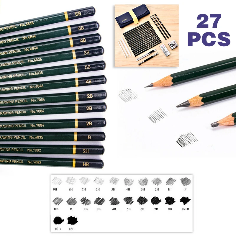 16 x карандаши для рисования (HB/1 шт., 2H/1 шт., B/1 шт., 2B/3 шт., 3B/1 шт., 4B/3 шт., 5B/1 шт., 6B/1 шт., 8B/1 шт., 9B/1 шт., 10B/1 шт., 12B/1 шт.)