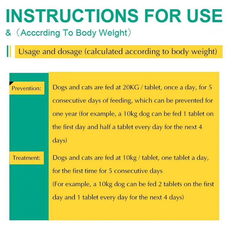 Использование и дозировка (рассчитывается в соответствии с весом тела) Профилактика: собаки и кошки питаются при 20 кг/таблетке, один раз в день, в течение 5 последовательных дней кормления, которые могут быть предотвращены в течение одного года (например, собака весом 10 кг может быть накормлена 1 таблеткой в первый день и половиной планшета каждый день в течение следующих 4 дней) Лечение: собаки и кошки питаются по 10 кг/таблетке, Одна таблетка в день, в первый раз в течение 5 дней подряд (Например, собака весом 10 кг может быть накормлена 2 таблетками в первый день и 1 таблеткой каждый день в течение следующих 4 дней),