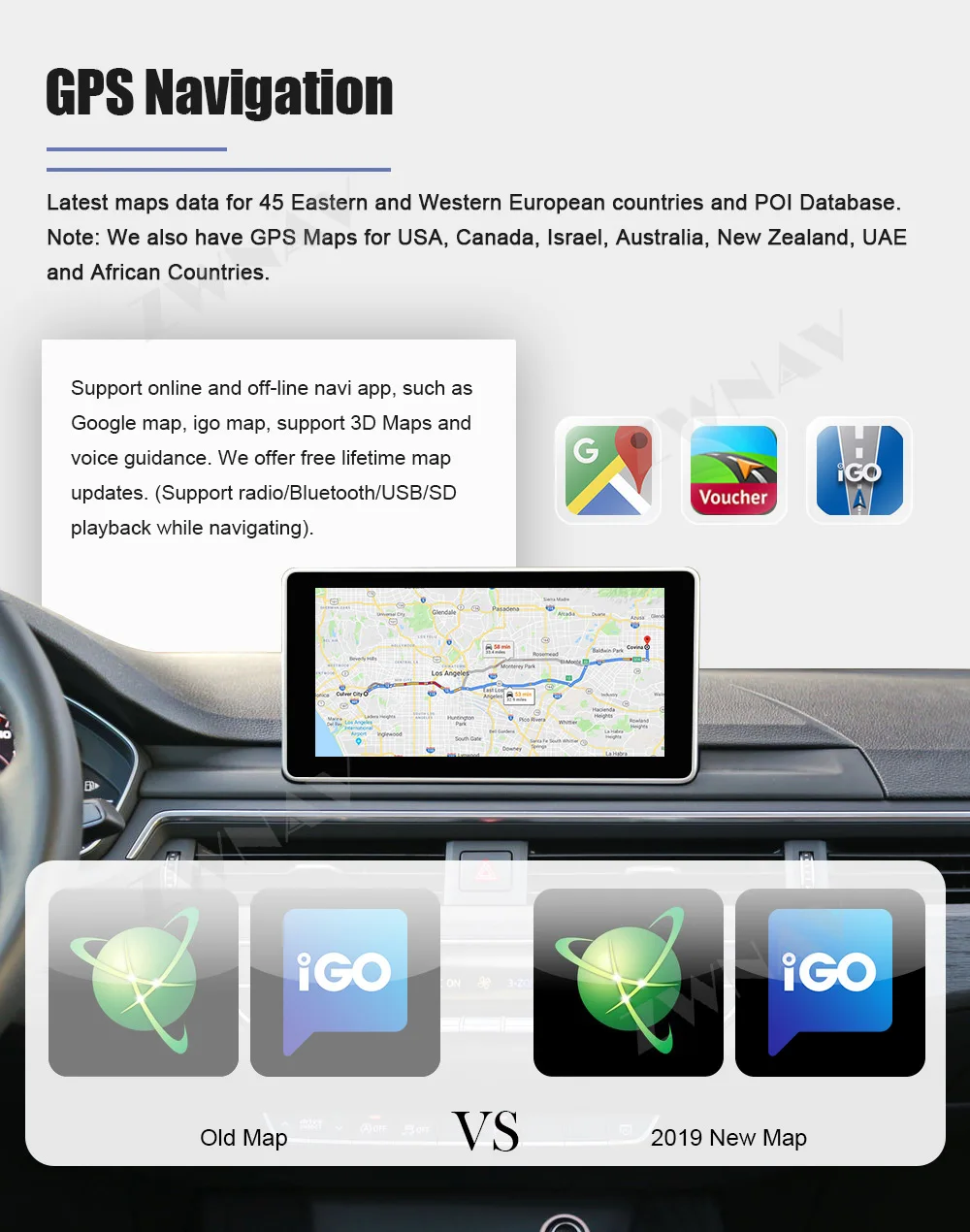 Наш продукт поставляется с GPS антенной, gps-картой для вашей страны, usb-адаптером, аудио и видео входным кабелем, кабелем питания... и т. д., все наборы для установки будут в посылка.
