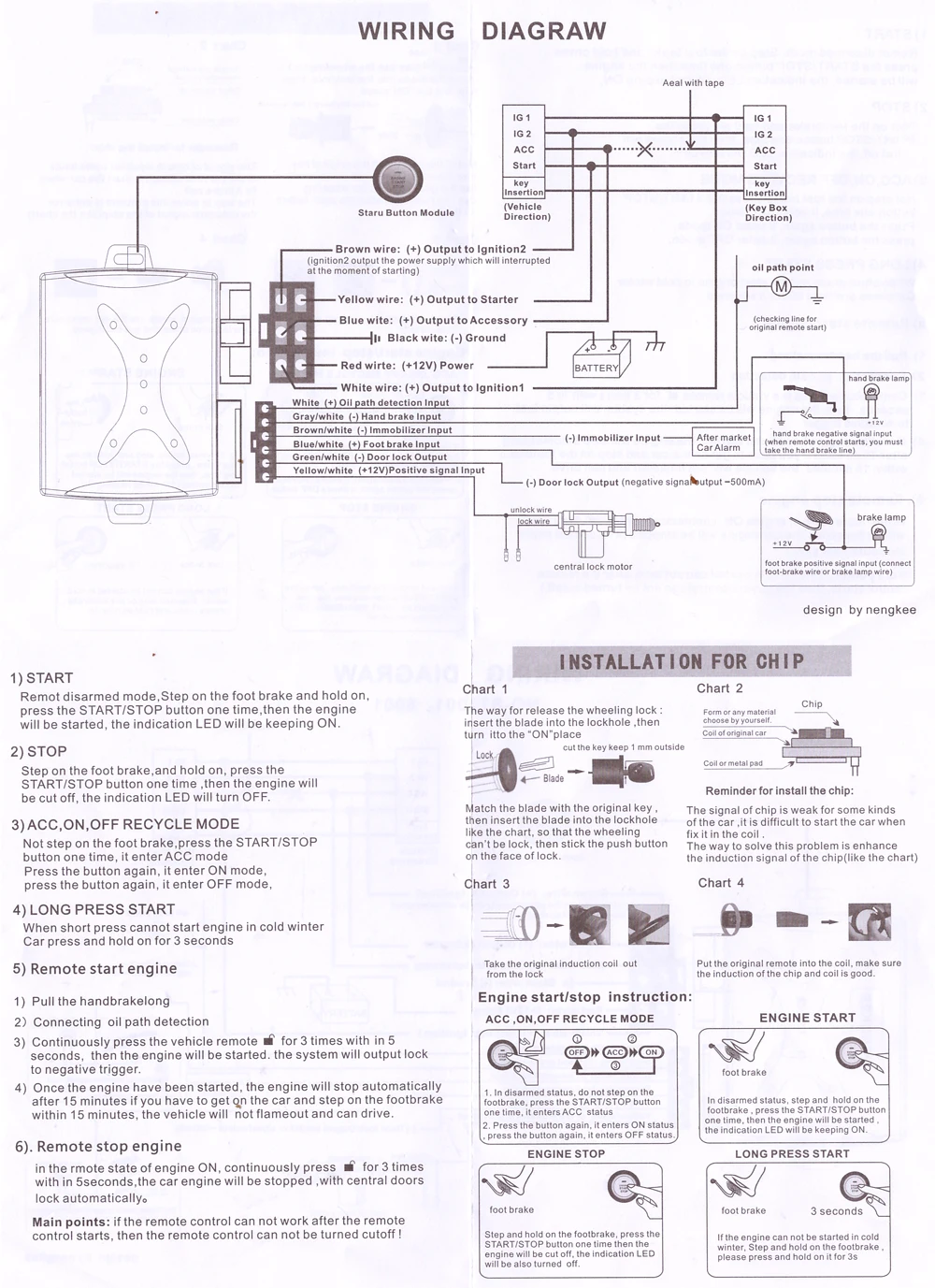 Особенности: 1, одна кнопка запуска: наступил на ножной тормоз, нажмите кнопку в ближайшее время. Нет необходимости использовать оригинальный автомобильный ключ. 2, одна кнопка остановки: нажмите кнопку в ближайшее время. 3. Удаленный запуск: Нажмите кнопку разблокировки 3 раза в течение 5 секунд. 4. Удаленная Остановка: Нажмите кнопку разблокировки 3 раза в течение 5 секунд. 5,ACC,On,OFF: Не нажимайте на ножной тормоз, нажмите кнопку в ближайшее время. 6. Автоматический замок: система автоматически блокирует двери автомобиля после запуска/остановки автомобиля Параметр: Вес изделия: 0,11 кг Вес посылки: 0,35 кг Размер продукта (Д x Ш x В): 8,70x8,50x3,00 см/3,43x3,35x1,18 дюймов Размер посылка (Д x Ш x В): 17x14x5 см/6,69x5,51x1,97 дюймов Посылка: 1 хост пускового устройства для автомобильного двигателя, 1 кнопка пускового запуска (1 м длина кабеля), 2 провода (0,6 м/1 м), 1 руководство пользователя на английском языке