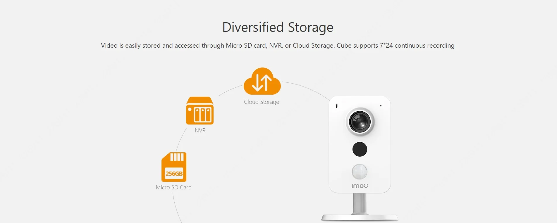 Видео легко хранится и доступен через карту Micro SD, NVR или Облачное хранилище. Cube поддерживает непрерывную запись 7*24