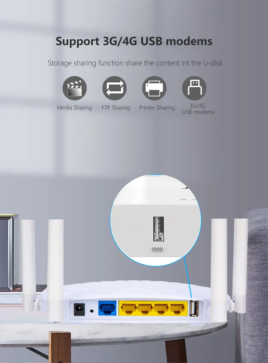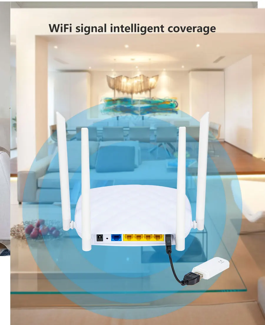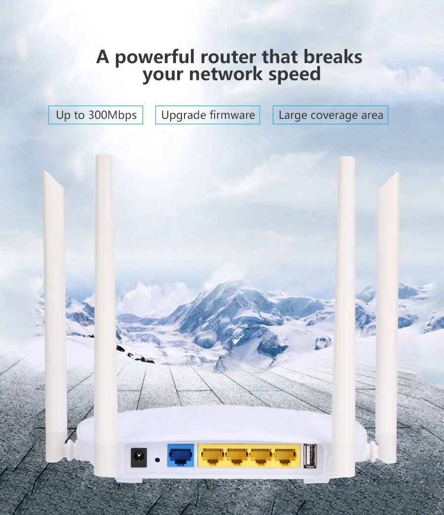 Поддержка сетевого протокола 802.11b/g/n, скорость передачи до 300 Мбит/с, внешние 4 антенны, зона покрытия больше.