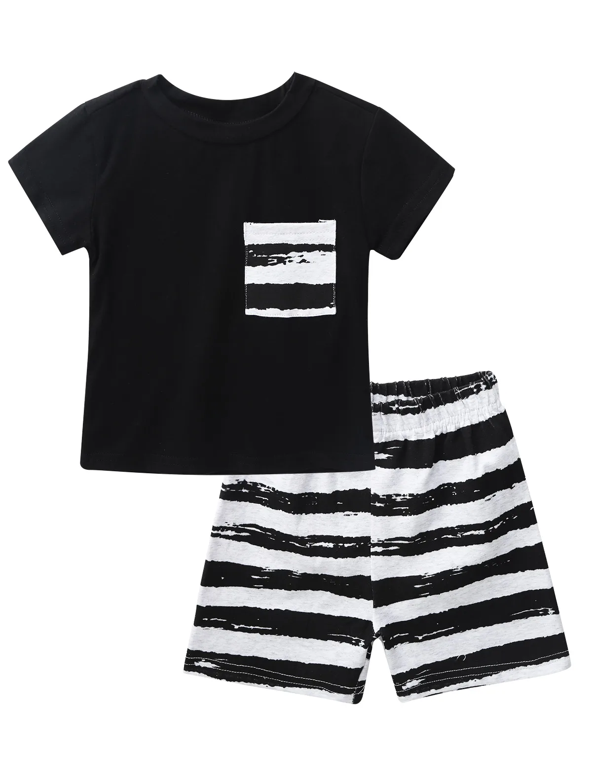 Short sleeves, crew neck, with one chest pocket. Pull on closure. Matching striped short pants with elastic waistband.