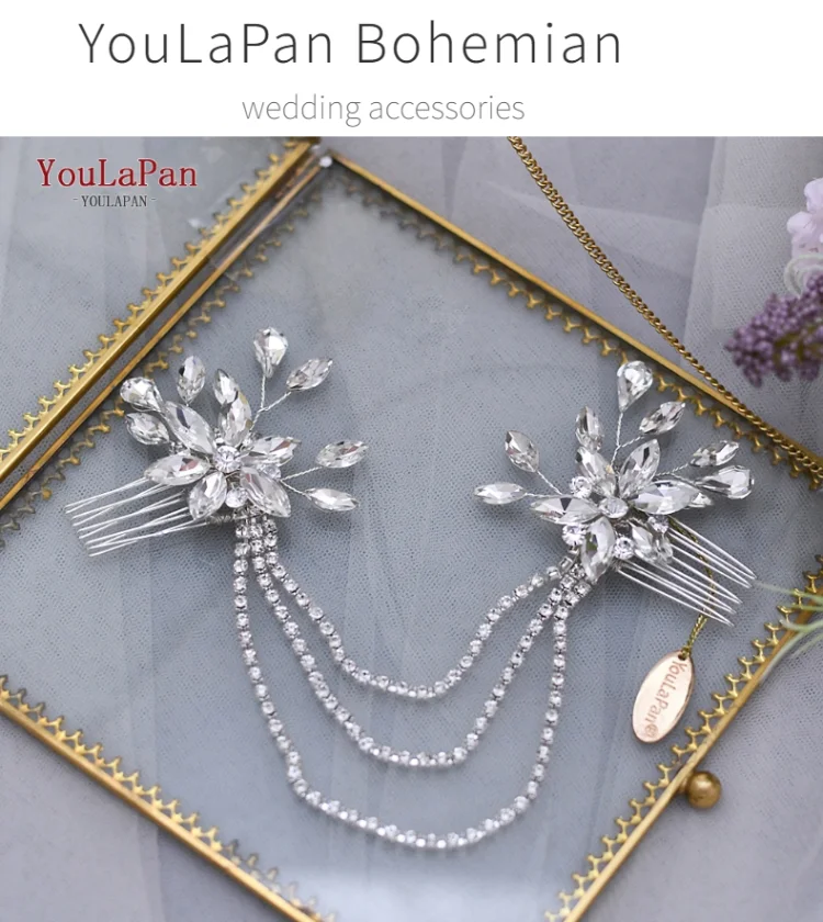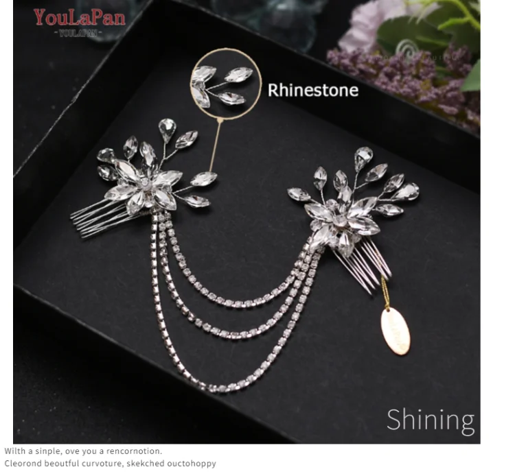 TOPQUEEN, серебряная цепочка с бриллиантами, свадебные гребни, свадебные головные уборы, свадебные аксессуары для волос, свадебная заколка для волос, двойная расческа для волос HP140
