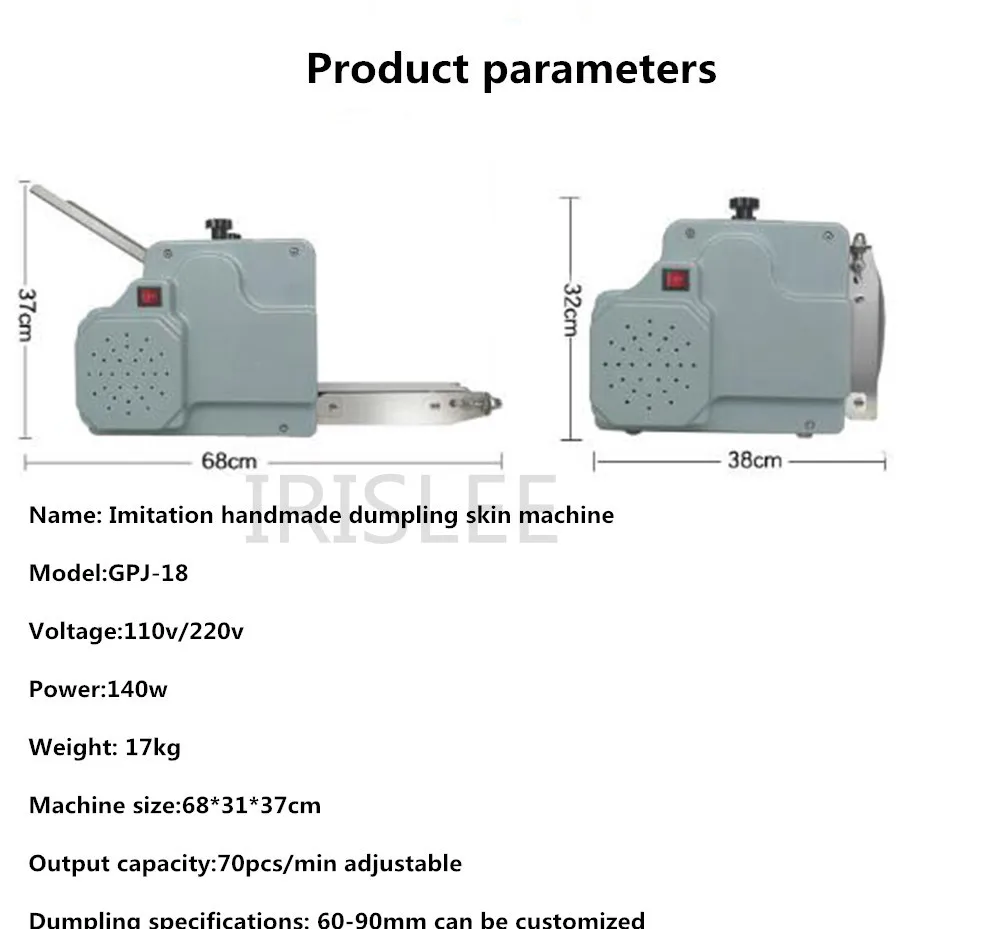 Название: имитация ручной работы клецки машина для кожи Модель: GPJ-18 Напряжение: 110 В/220 В Мощность: 140w Вес: 17 кг Размер машины: 68*31*37 см Выходная мощность: 70 шт/мин регулируемая Характеристики клецки: 60-90 мм могут быть настроены Форма формы: круглая, квадратная, алмазная, овальная, на заказ