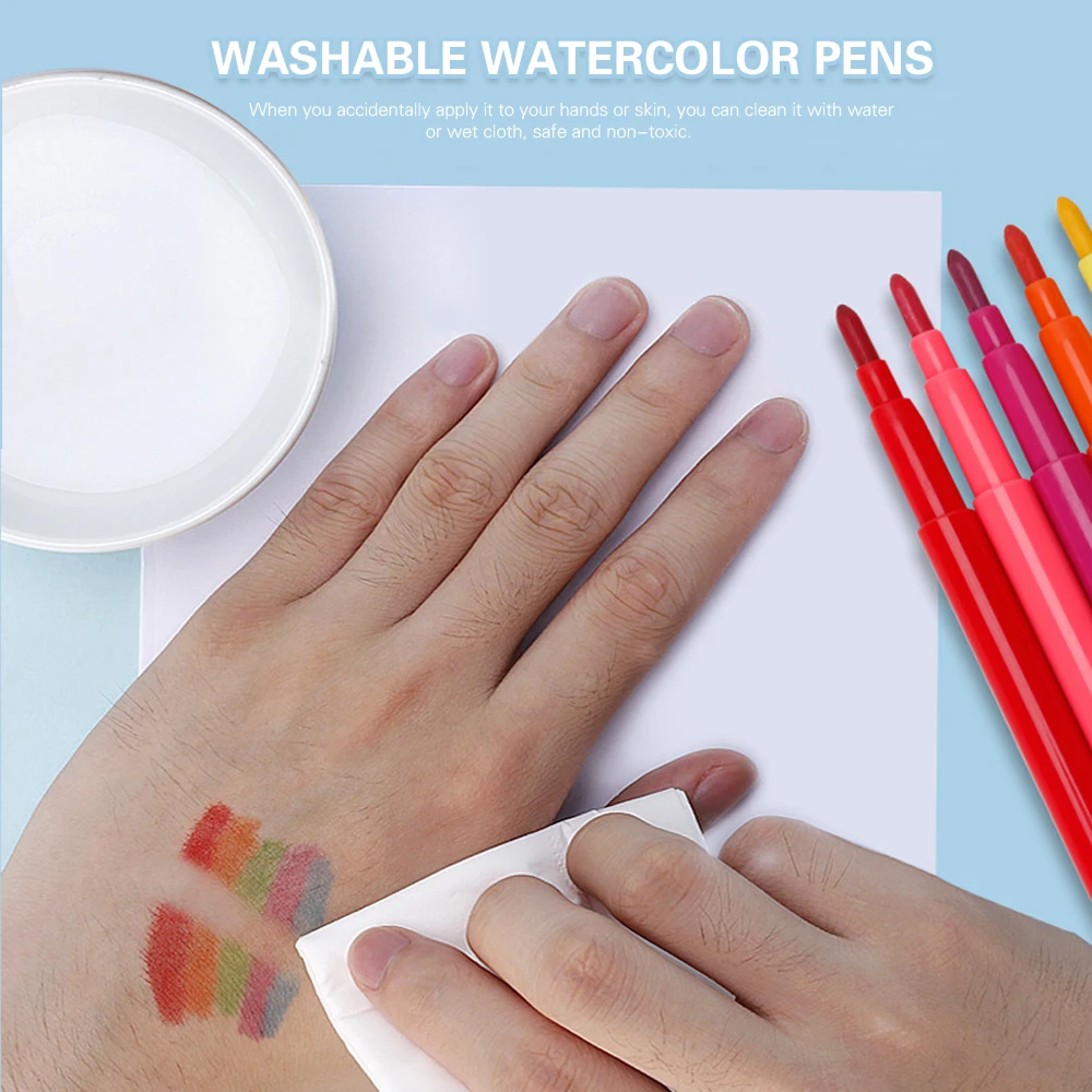 Ручки водного цвета можно стирать. При случайном нанесении на руки или кожу, вы можете очистить его водой или влажной тканью, безопасный и нетоксичный.