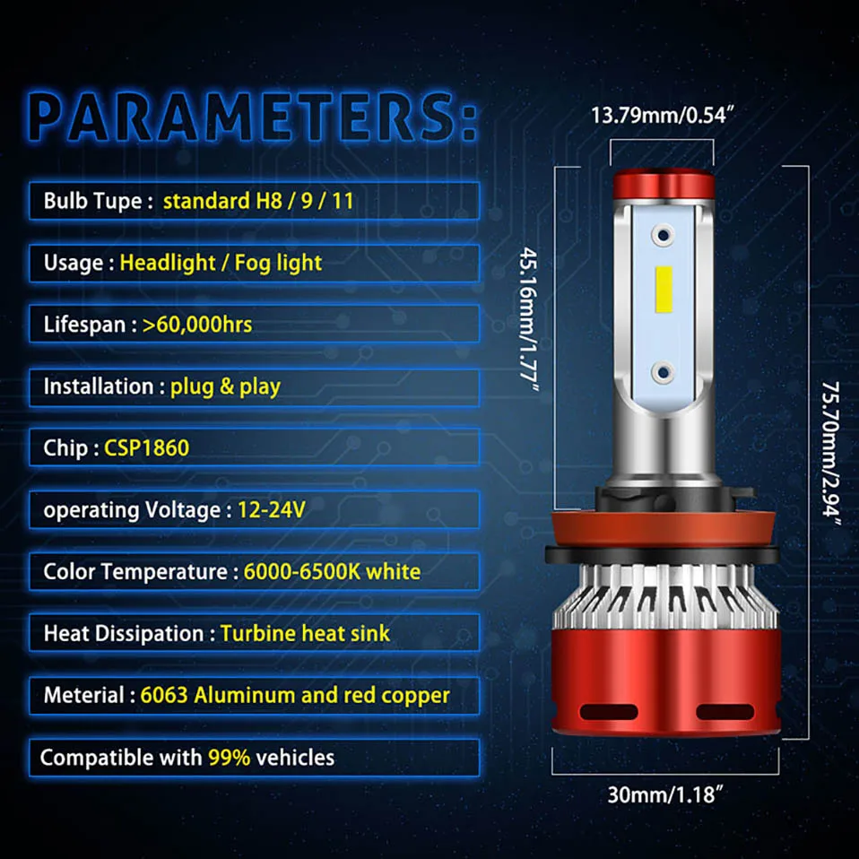 1. Модель: H1 H3 H4 H7 H11 9005 9006 9012 2. Рабочее напряжение: DC11-30V 3. Люмен: 12000 лм/пара 4. Мощность: 30 Вт 5. Количество лампочек: CSP1860 6. Цветовая температура: 6000K-6500K белый. 7. Теория рассеивания тепла: авиационный алюминий 6063 8. Услуги срок службы:> 50000 часов 9. Количество светодиодный: 24 шт. и 12 шт. 10. Электрический ток: 2,8 ± 0.3A 11. Угол луча: 360 ° градусов