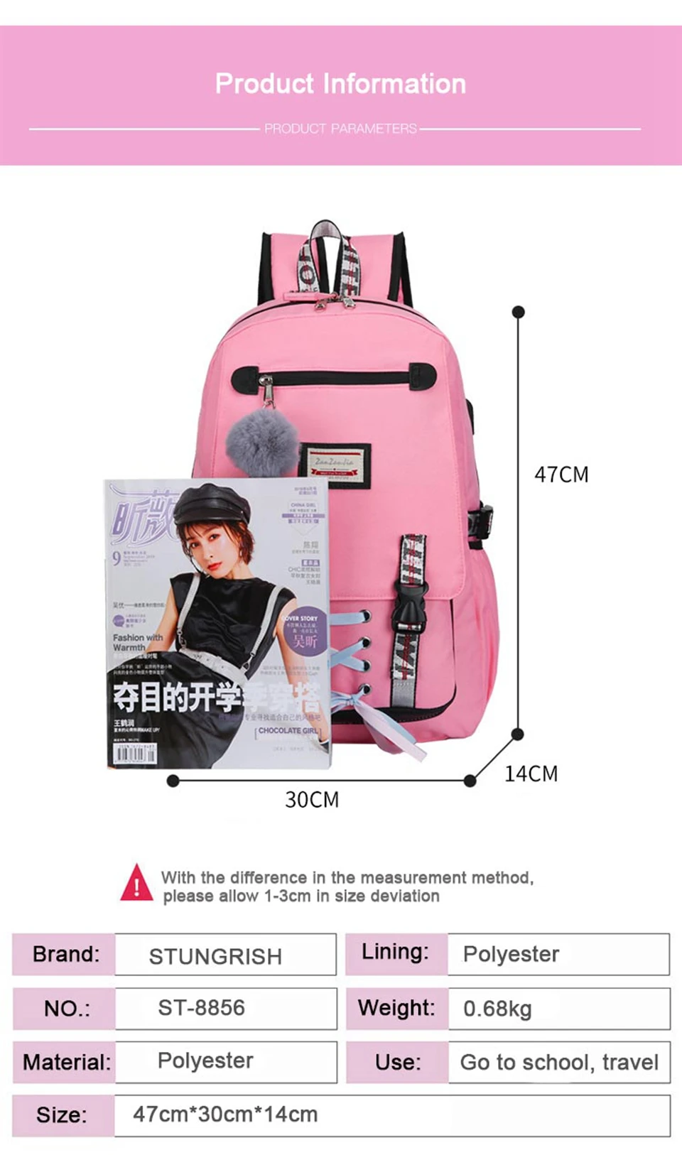 Размер рюкзака (приблизительно): длина 30 см; Ширина 14 см; Высота 47 см Материал: водонепроницаемый полиэстер Вес: 0,6 кг Применение: школьные сумки для девочек Стиль: школьные сумки/Школьный рюкзак/сумки для книг Посылка: 1x школьный рюкзак 1x сумка-холодильник 1x юбка-баллон из плюша 1x Анти-Вор замок 1. Примечания: замеры сделаны вручную, поэтому возможны отклонения на 1-3 см. 2. Все измерения в см, пожалуйста, обратите внимание, что 1 см = 0,3937 дюйма, 1 дюйм = 2,540 см