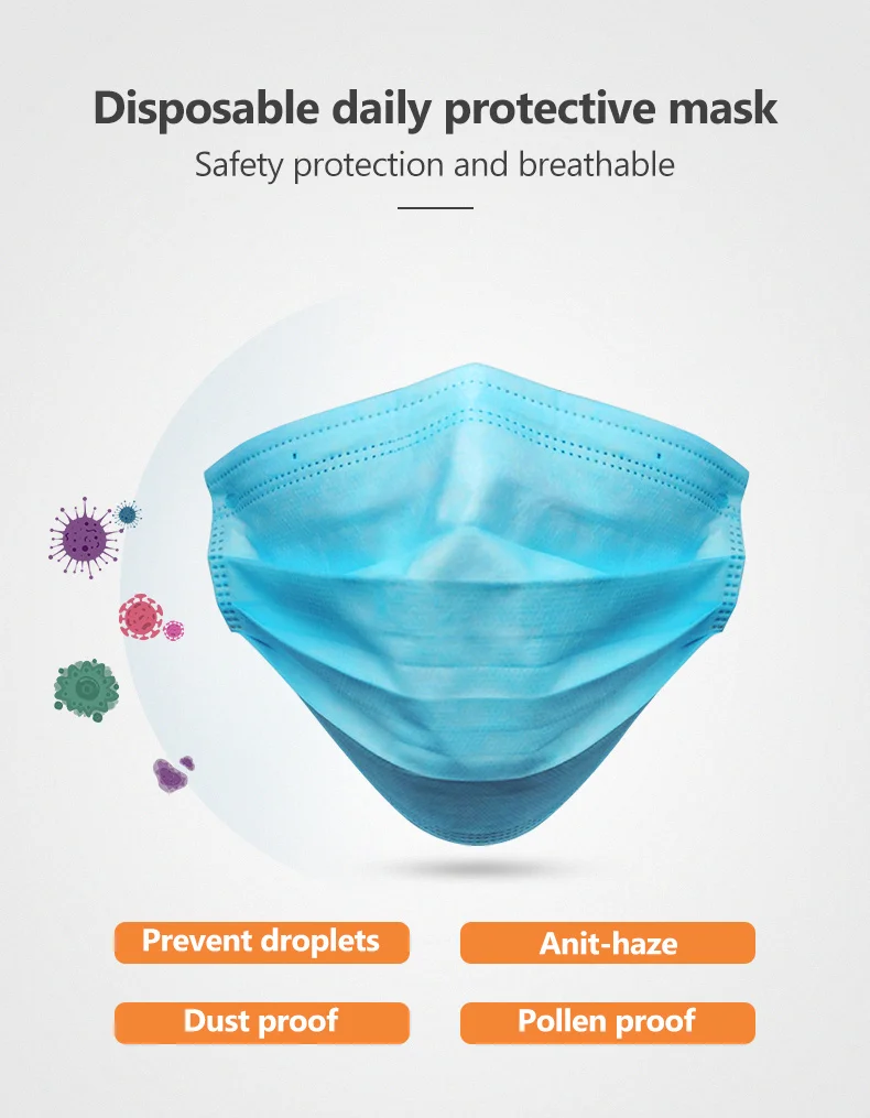 Основные характеристики: 1. Широкая эластичная петля для ушей Более удобный и не легко отвалится 2. 3 слоя нетканого материала, предотвращают попадание капель, анти-дымку, Пыленепроницаемость, пыльца и т. д. Наружный нетканый защитный слой, фильтр среднего расплава, внутренний мягкий, приятный для кожи нетканый материал 3. Регулируемый зажим для лица, который подходит для лица (планка моста) Одна щепотка может подогнать лицо, как вам нравится, не легко упасть 4. Плиссированная маска 360 ° подходит для лица и пространство для дыхания Размер изделия: 14,5 см * 9 см Упаковка: 50 ⑤ кор., 2 коробки Примечание: у нас есть белый и синий цвета, цвет будет выбран случайно.