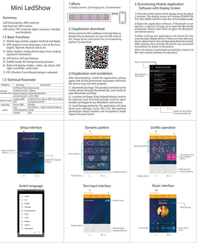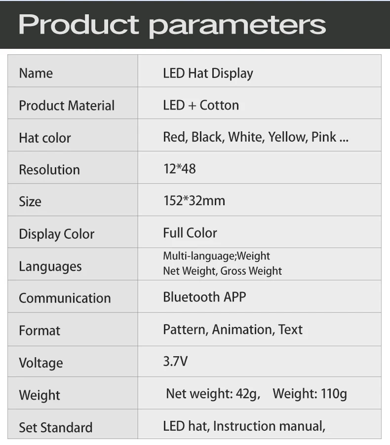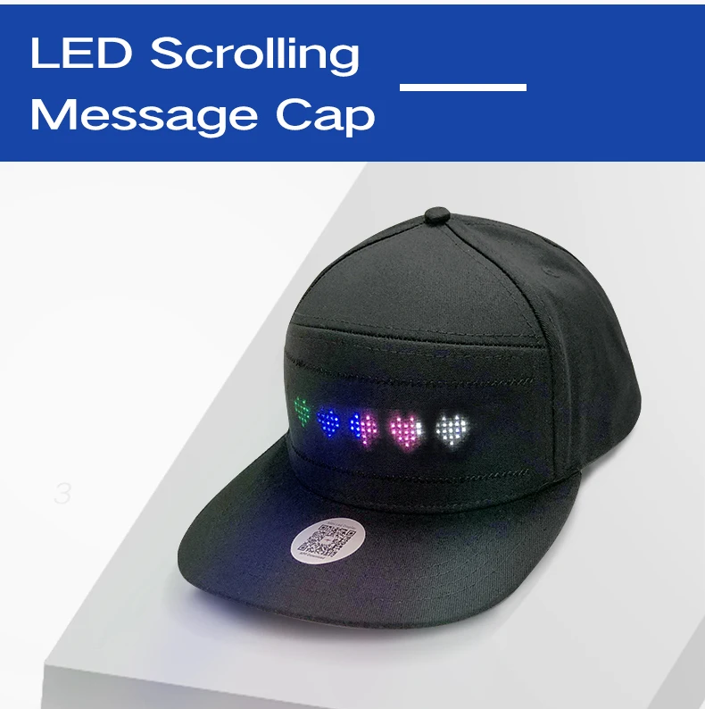 Цвет шляпы: красный, синий, черный, белый Шляпа Материал: хлопок Светодиодный Размер панели: 150*32 мм Светодиодный Цвет: красный, синий, зеленый, смешанный Одноцветный, белый Язык: несколько Язык Формат поддержки: текст, узор, GIF, граффити Связь: Bluetooth Приложение: Мини ledshow