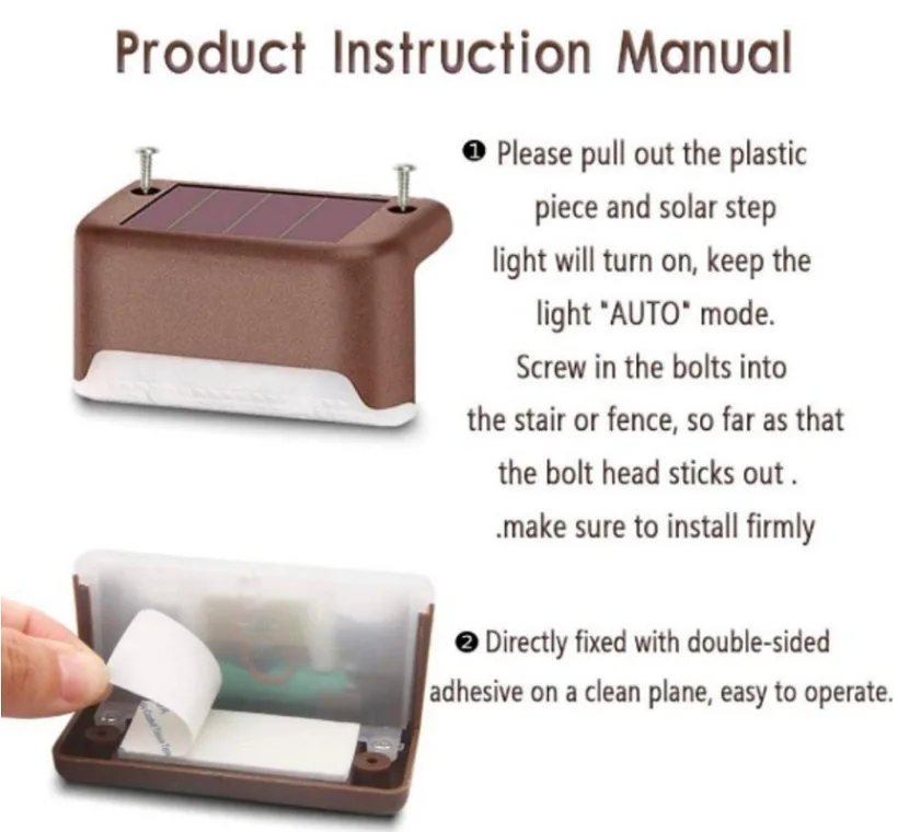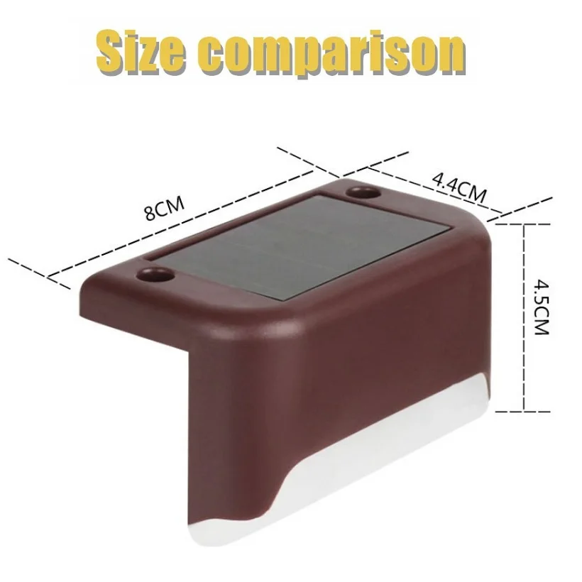 Этот новый солнечный шаговый светильник хорошо подходит для домашнего сада, ландшафта, патио, улицы, канала, площади перила светильники на забор. Изготовлен из корпуса ABS и встроен один супер яркий светодиодный чип для обеспечения его яркости. Мы предлагаем холодный белый, коричневый корпус на выбор.