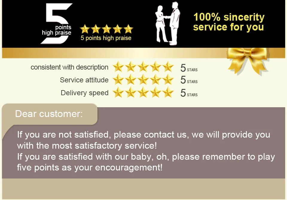 Удовлетворение ваших запросов и положительная обратная связь очень важны для нас. Пожалуйста, оставьте положительные отзывы и 5 звезд, если вы удовлетворены нашими товарами и услугами. Если у вас есть какие-либо проблемы с нашими товарами или услугами, пожалуйста, не стесняйтесь связаться с нами, прежде чем оставить отрицательный отзывы. Мы сделаем все возможное, чтобы решить любые проблемы и предоставить Вам лучшее обслуживание клиентов.