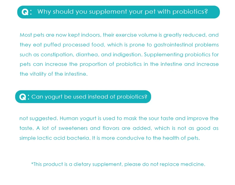 Этот продукт используется при диарее, мягких табуретах, запорах, вызванных дисбалансом кишечной флоры; Для регулирования и поддержания желудка; Он используется для здоровья кишечника щенков от отлучения и пожилых собак, для укрепления поглощения и использования питательных веществ; Для снятия непереносимости лактозы. * Можно облизывать непосредственно или смешивать с едой, или смешивать с холодной водой ниже 37 ℃. * Если вы принимаете антибиотики одновременно, вы должны принять этот продукт через 3-6 часов после приема антибиотиков и использовать его как можно скорее после открытия пакета. Часто задаваемые вопросы Почему вы должны дополнять своего питомца пробиотиками? Большинство домашних животных в настоящее время находятся в помещении, их объем упражнений значительно уменьшается, и они едят пышную обработанную еду, которая подвержена желудочно-кишечным проблемам, таким как запор, диарея и расстройство желудка. Дополняя пробиотики для домашних животных, можно увеличить долю пробиотиков в кишечнике и повысить жизненную силу кишечника.