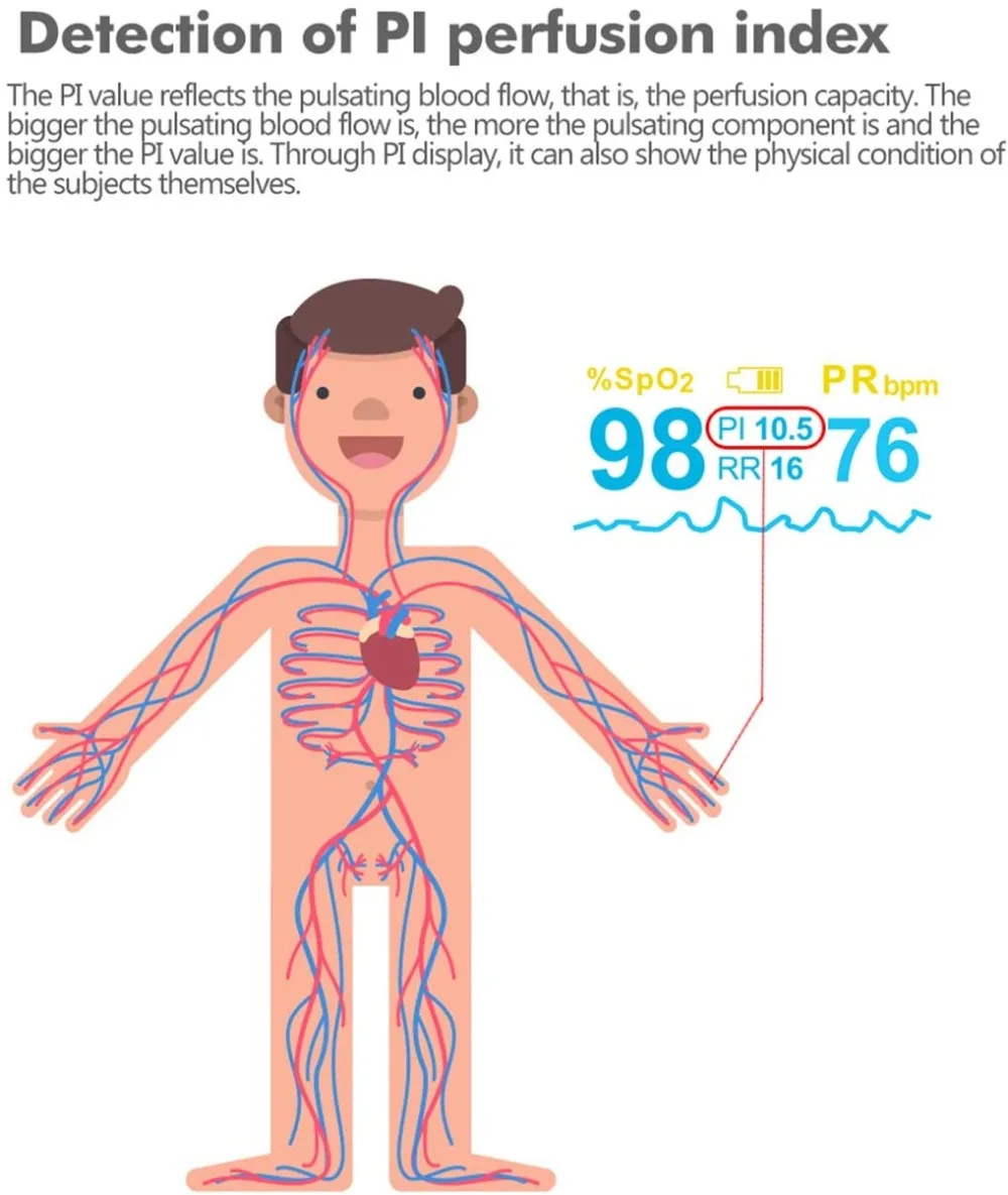 1. Параметры отображения: кислород в кровиSPO2Значение, пульсPRСтоимость,Измеритель уровня кислорода в крови,Диаграмма импульсной формы волны,PI(Индекс перфузии),Частота дыханияПараметры мониторинга (130R),Мониторинга снаПараметр (131R).2. Экран дисплея: продукт принимает синий и желтый oled-дисплей, и яркость регулируется в 5 уровнях.3. Режим отображения:4 направления, 6 режимов отображения.4. Энергосбережение и охрана окружающей среды: продукт имеет низкое энергопотребление, и оборудованный аккумулятор 2AAA может работать более чем40 часов.5. Предупреждение о напряжении: когда слишком низкое напряжение батареи может повлиять на нормальное использование, есть Предупреждение о низком напряжении.6. Автоматическое выключение: Когда сигнал не генерируется, продукт автоматически отключится после8 секундПараметры продукта:Диапазон измерения насыщения кислорода в крови: 70% ~ 99%Точность измерения насыщения кислородом в крови: ± 2% в диапазоне 70% ~ 99%, ≤ 70% не определяетсяРазрешение насыщения кислородом: насыщение кислородом ± 1%Время наблюдения за сном: 130R: нет, 131R: 8 часовАвтоматическое выключение: когда палец не вставлен, он автоматически отключится в течение 8 секундВлажность хранения: 15% ~ 80% при работе, 10% ~ 80% хранениеБатарея Тип: 2*1,5 V (2 ААА щелочные батареи, товар никоим образом не содержит батарейки)Диапазон измерения пульса: 30BPM ~ 240BPMТочность измерения пульса: ± 1BPM или ± 1% от измеренного значения (в зависимости от того, что больше)Индекс перфузии кровотока: ≥ 0.2%, ± 0.1%Потребляемая мощность: менее 30 мАРабочая температура: 5 ℃ ~ 40 ℃Атмосферное давление: 70 кПа ~ 106 кПаМатериал: АБС-пластик + ПоликарбонатПосылка:-1 x оксиметр Пальца-Ремешок-1 шт.-1 х белая подкладка для карт-Руководство пользователя на английском языке-1 шт.-Цветная коробка-1 шт.