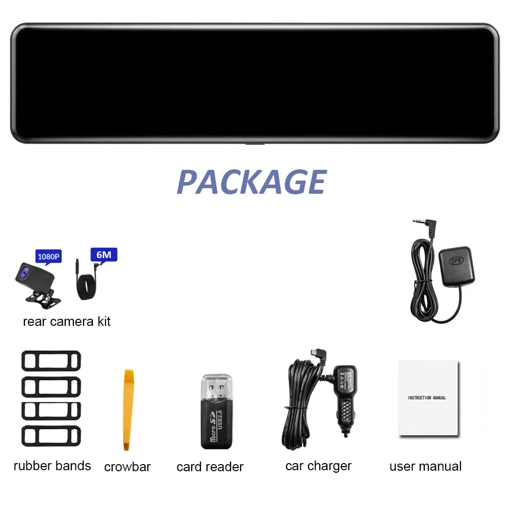 D400 зеркало, GPS антенна, 1080P задняя камера + задний кабель, автомобильное зарядное устройство, руководство пользователя, резиновые полосы, Коронка, кардридер