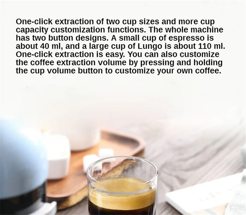Небольшая чашка эспрессо составляет около 40 мл, а большая чашка лунго-около 110 мл. Извлечение одним нажатием легко.