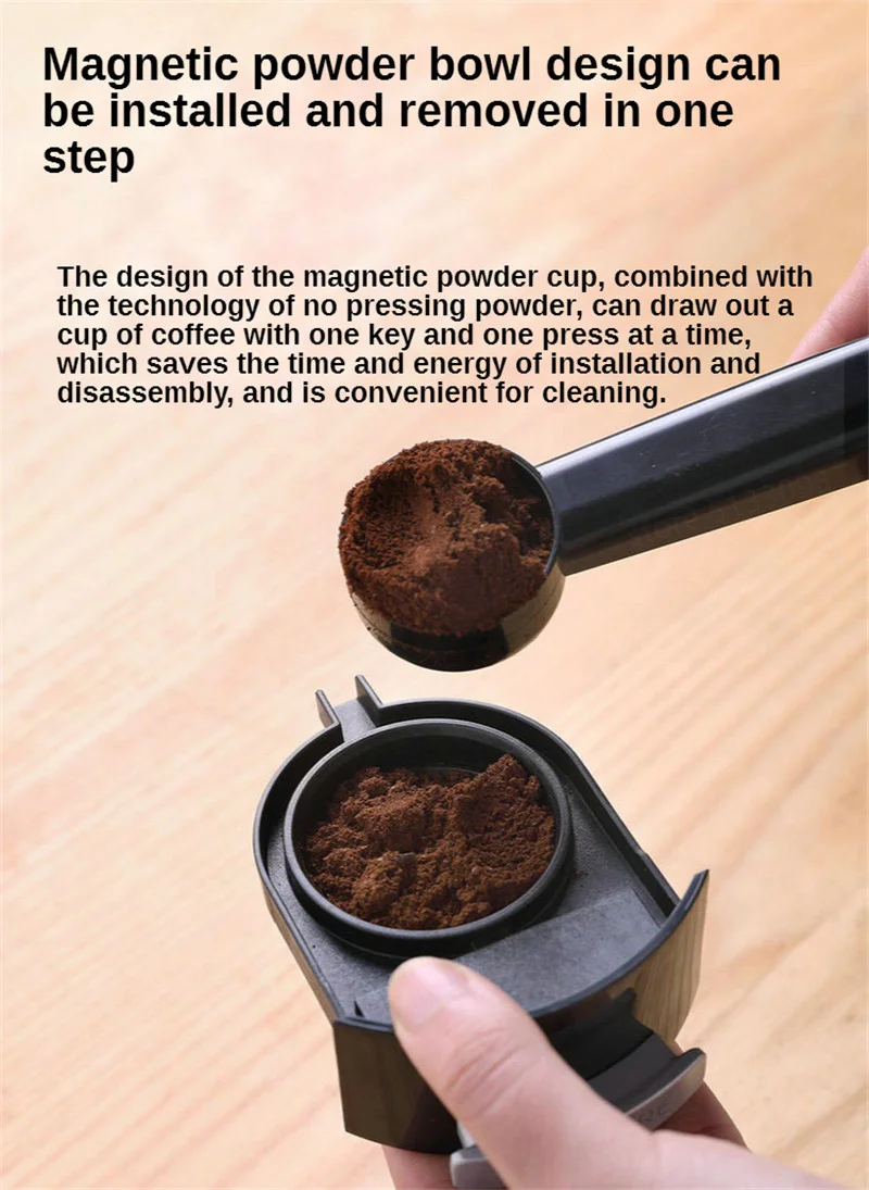 Конструкция магнитной порошковой чашки, в сочетании с технологией без прессования порошка, может вытягивать чашку кофе одной клавишей и одним нажатием одновременно, что экономит время и энергию установки и разборки, и удобен для чистки.