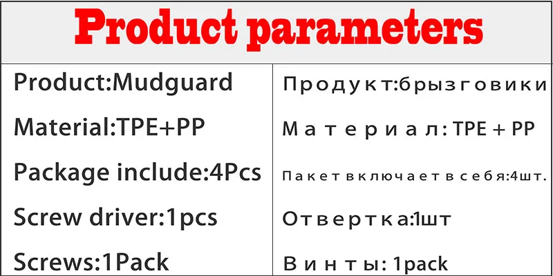 Название продукта: брызговик Материал: ТПЭ + ПП Комплекпосылка: 4 шт. Отвертка: 1 шт. Винт: 1 посылка